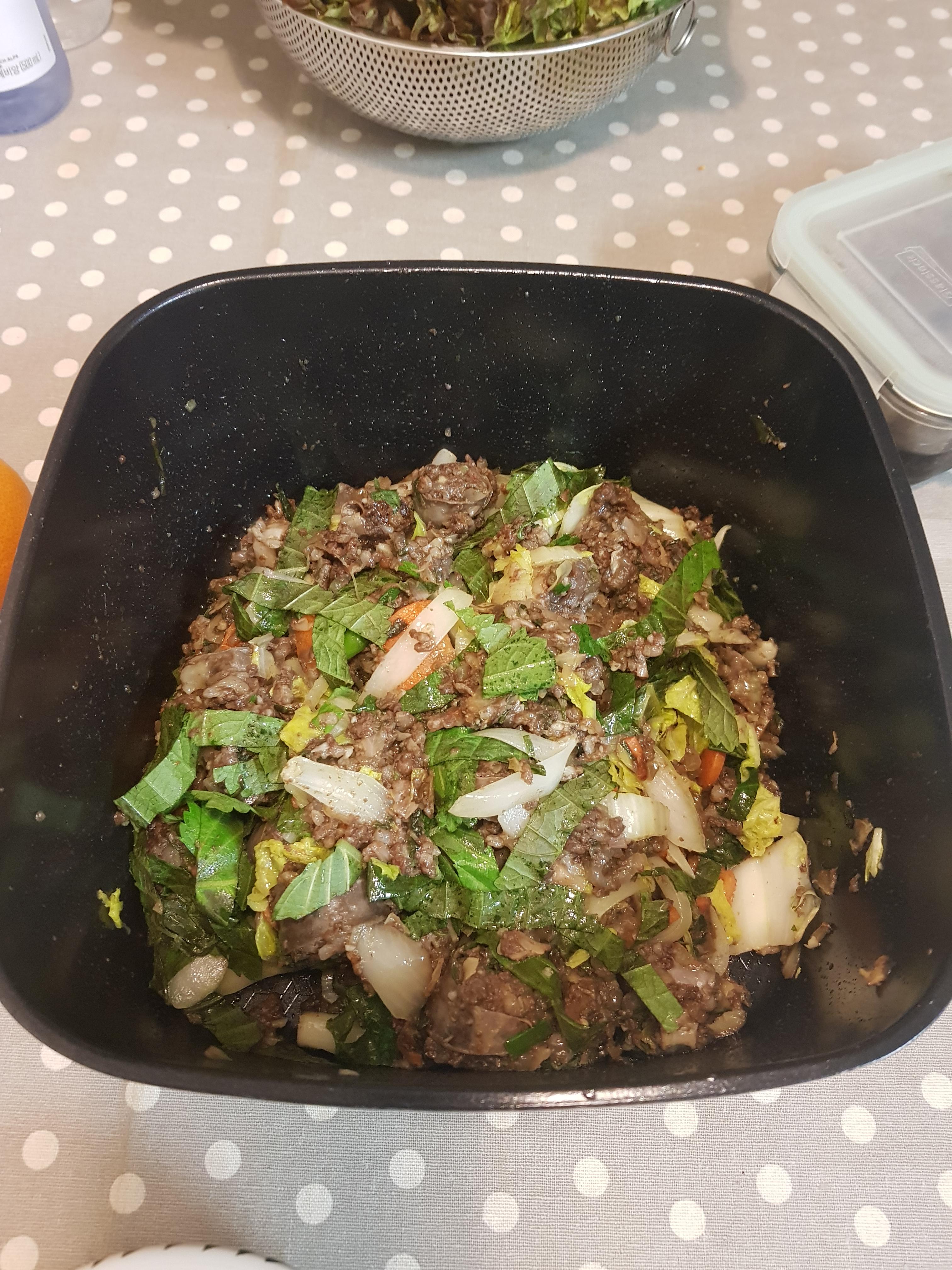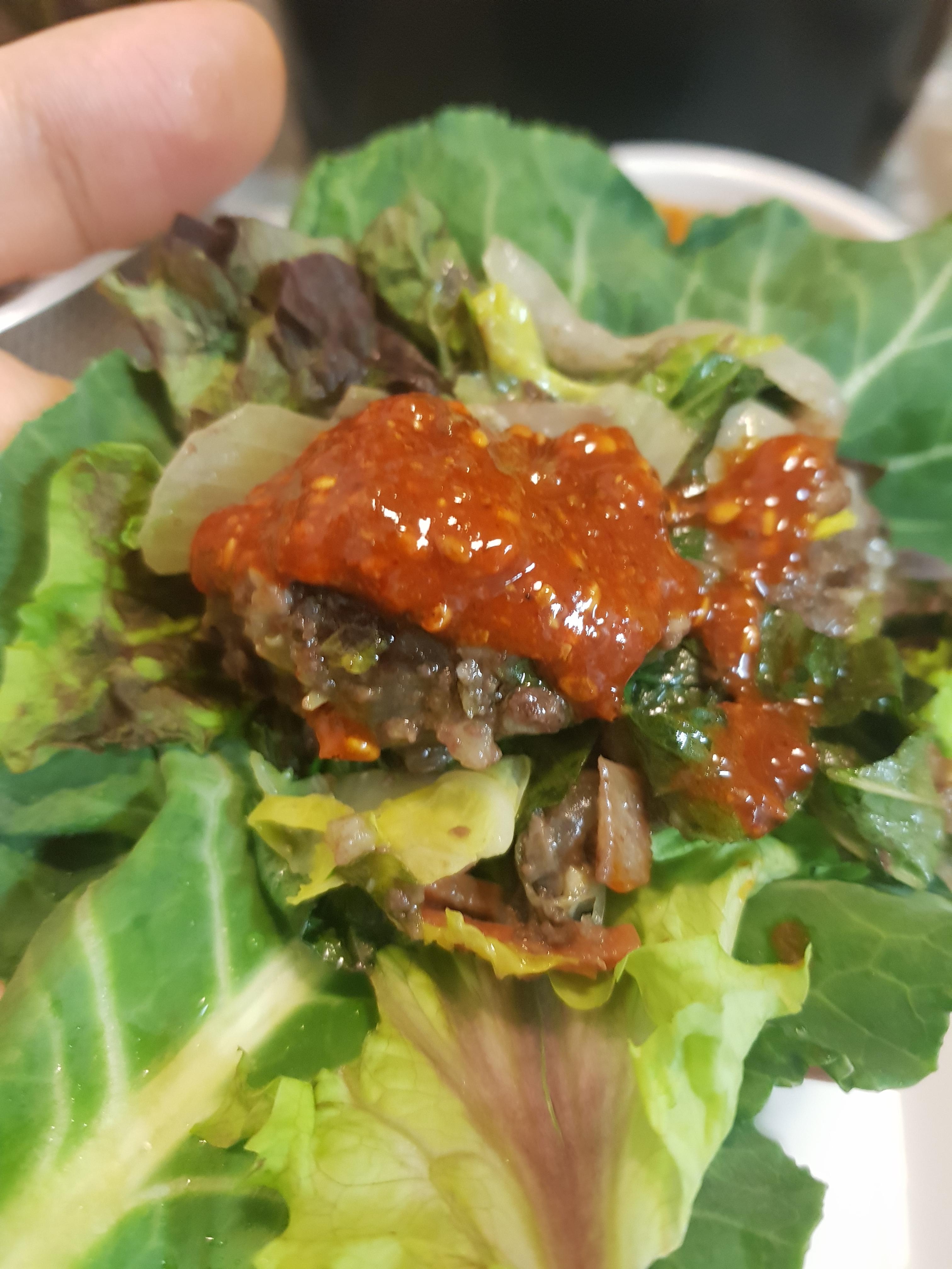 완성된 순대볶음을 준비된 쌈채소에 올려서 직접 만든 소스를 찍어 보았어요.