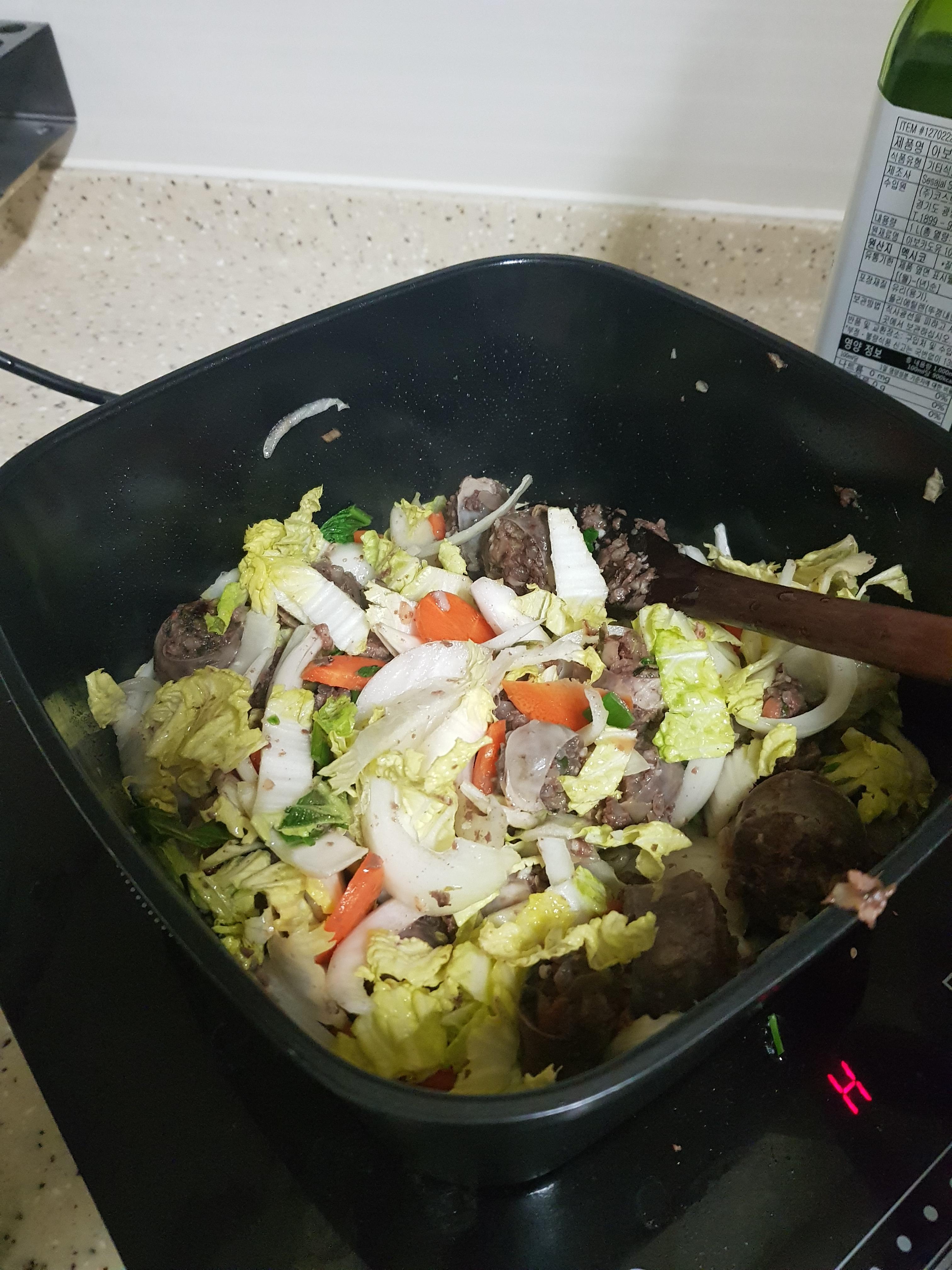 소스를 만드는 동안 파 기름을 만들던 보오글 냄비에 준비된 순대와 야채를 한 번에 넣고 볶아줍니다.