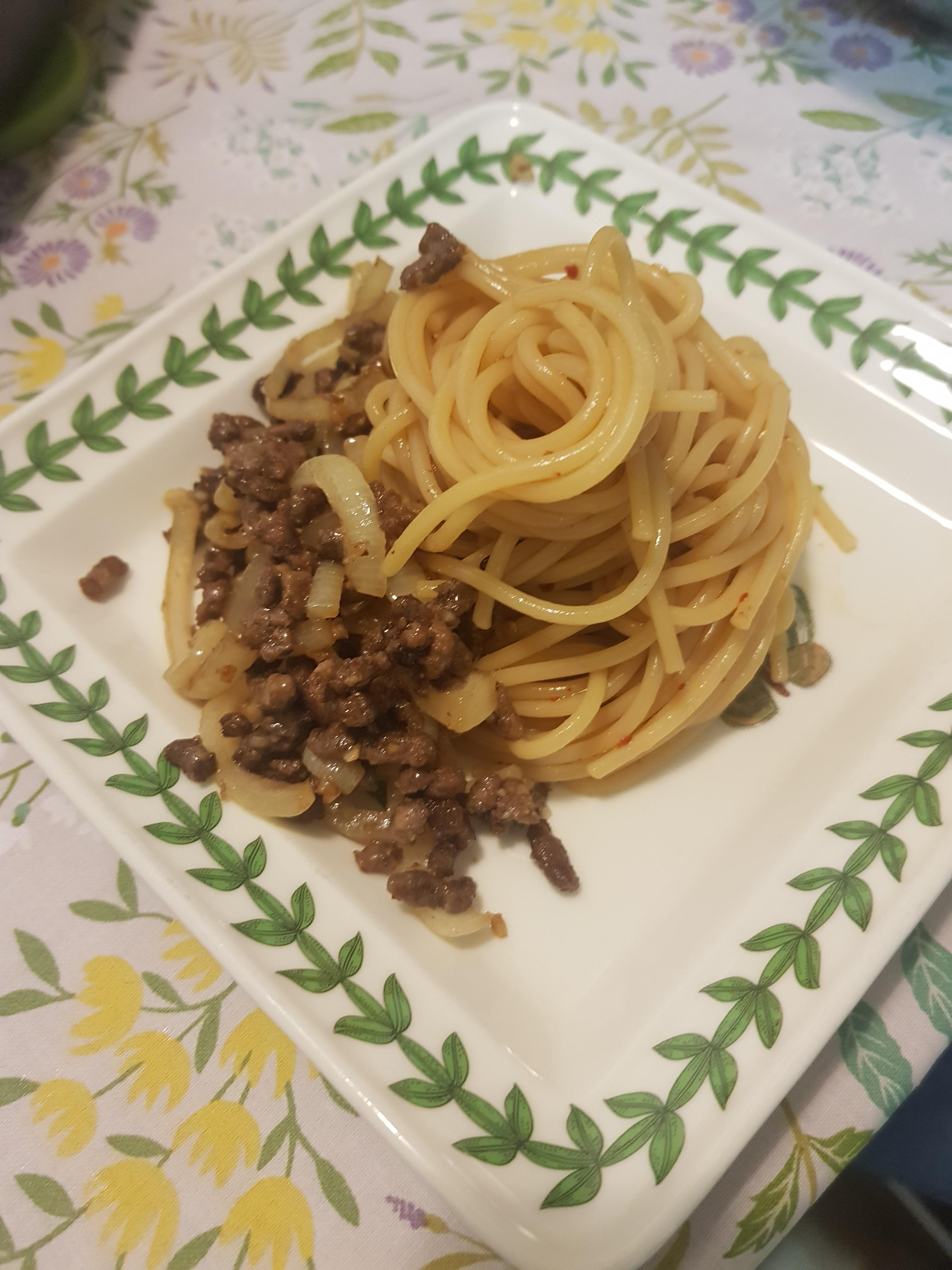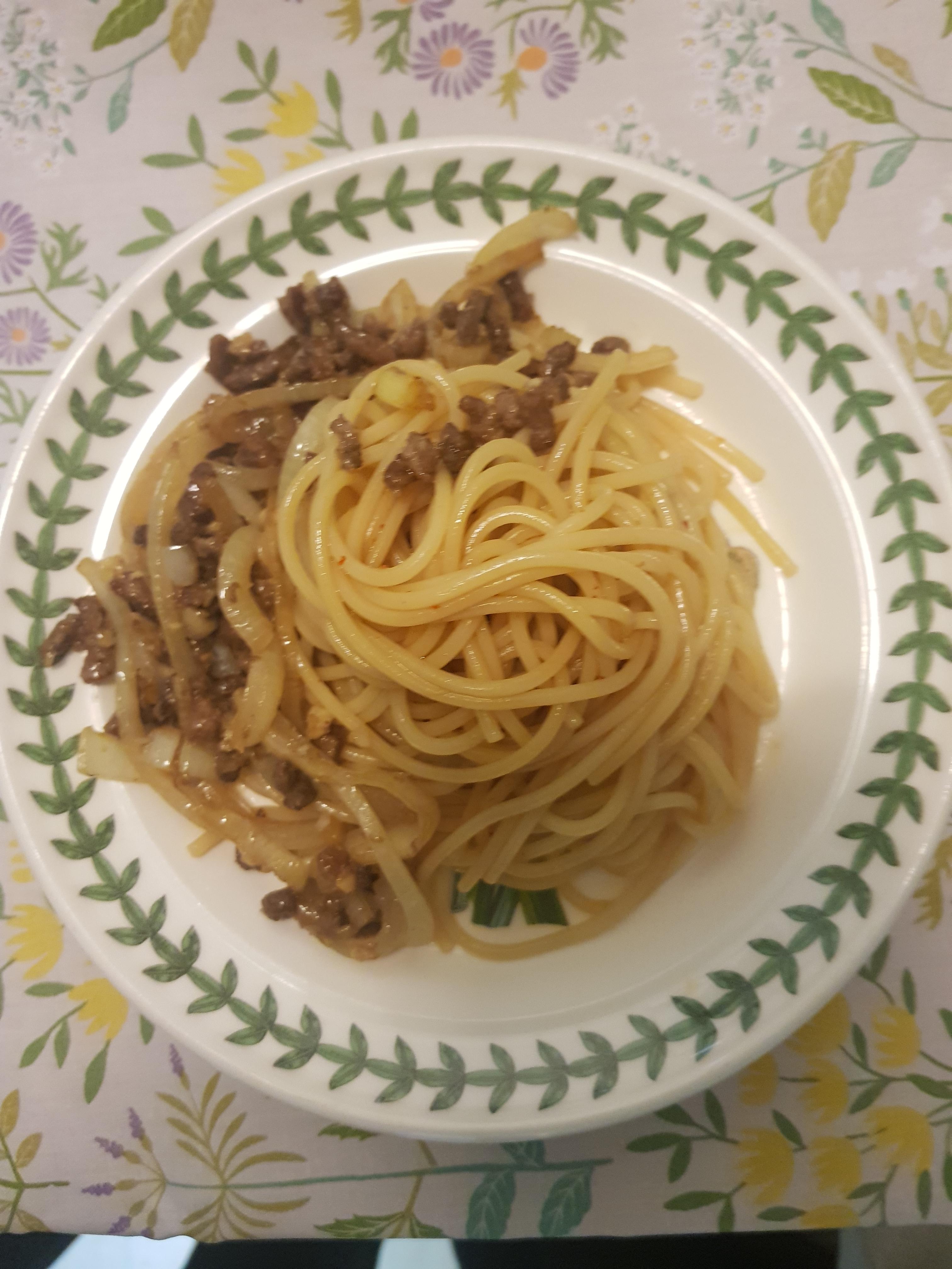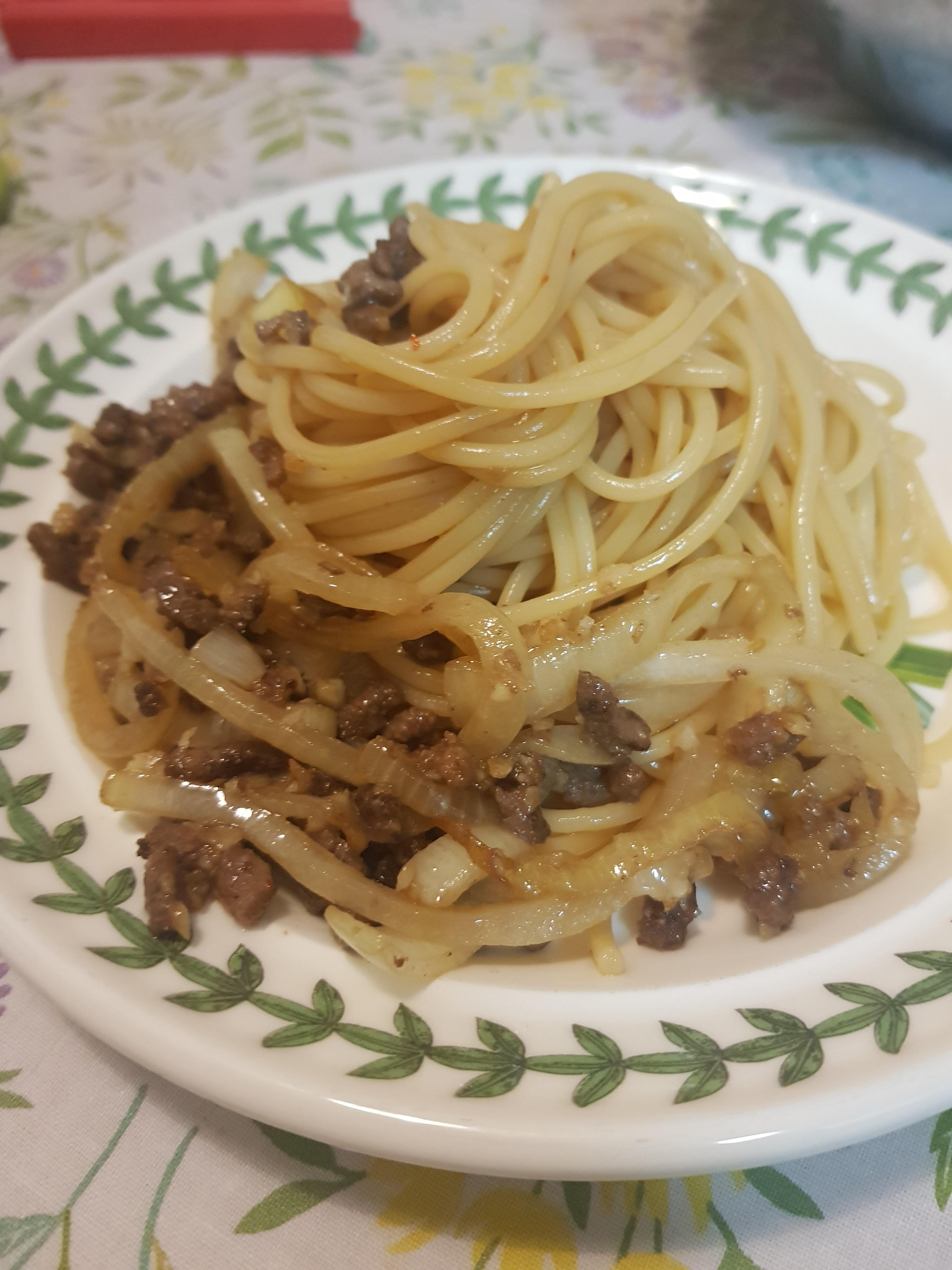 참기름, 간장, 식초, 파스타면, 소고기 다짐육, 양파, 편마늘(없으면 다진 마늘), 굴소스