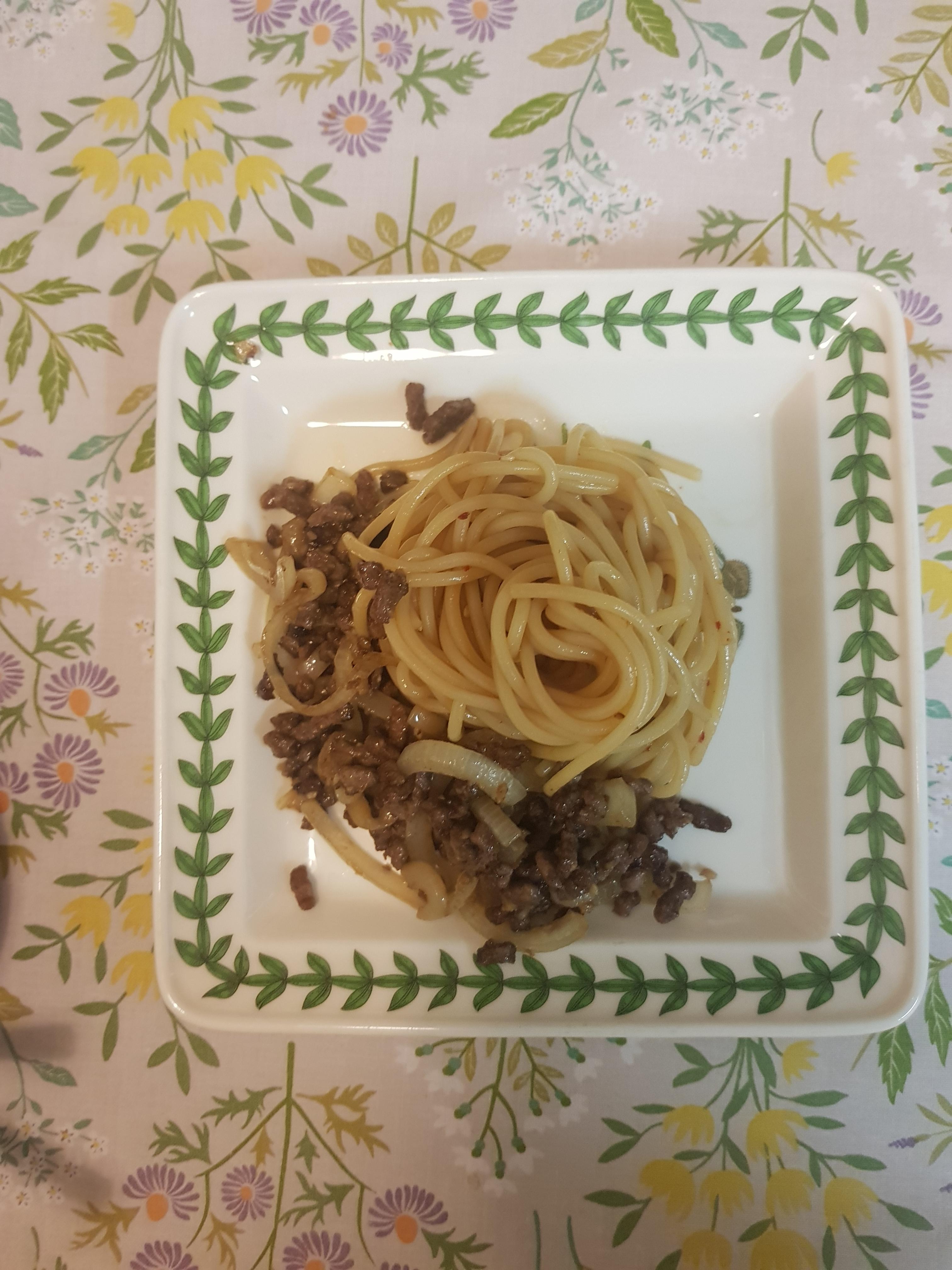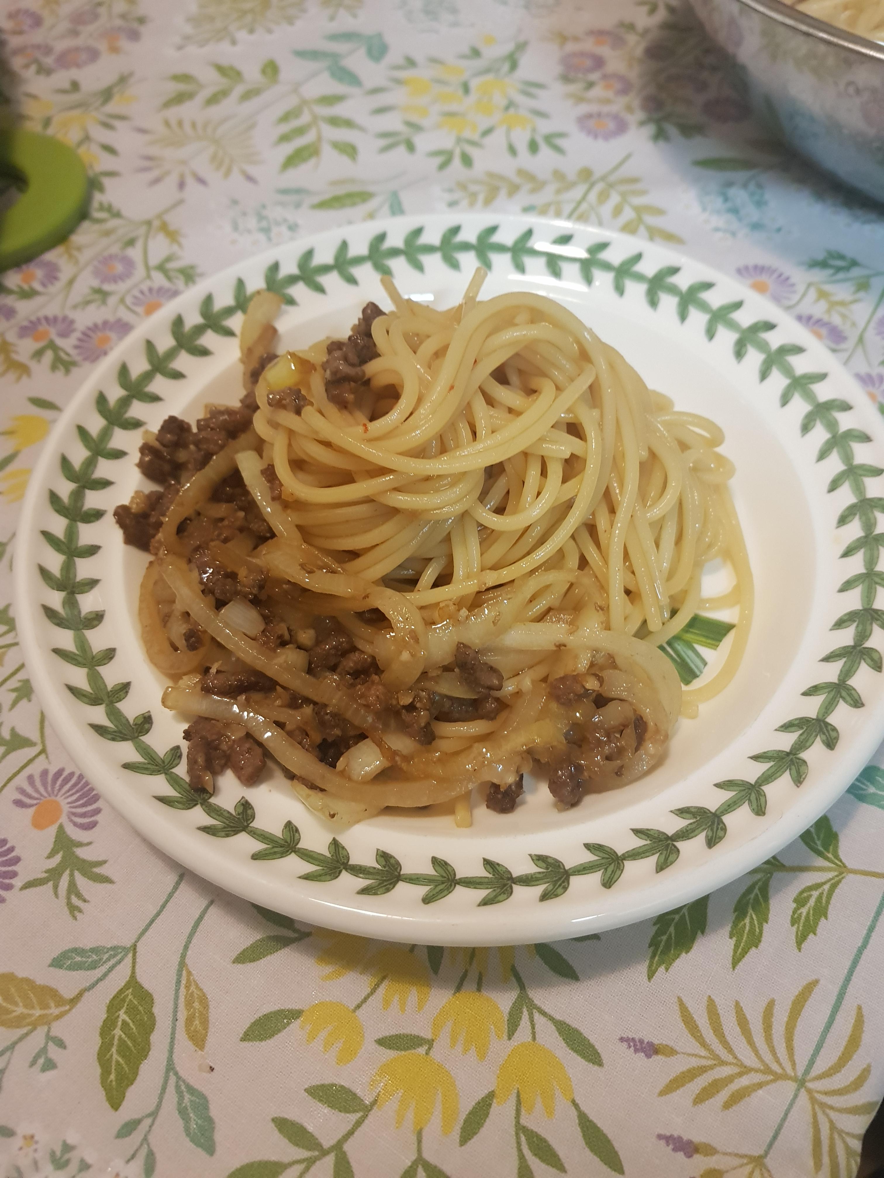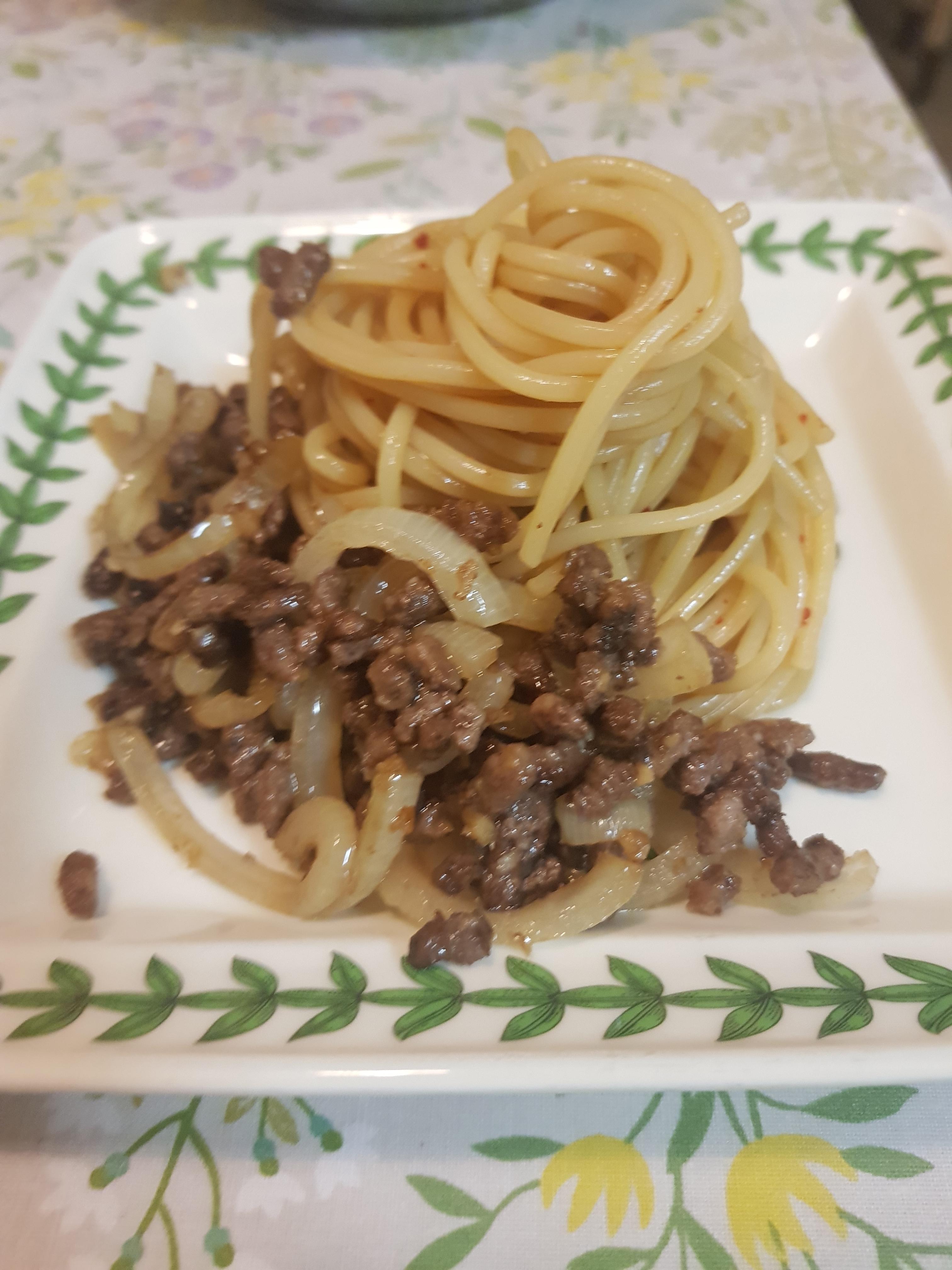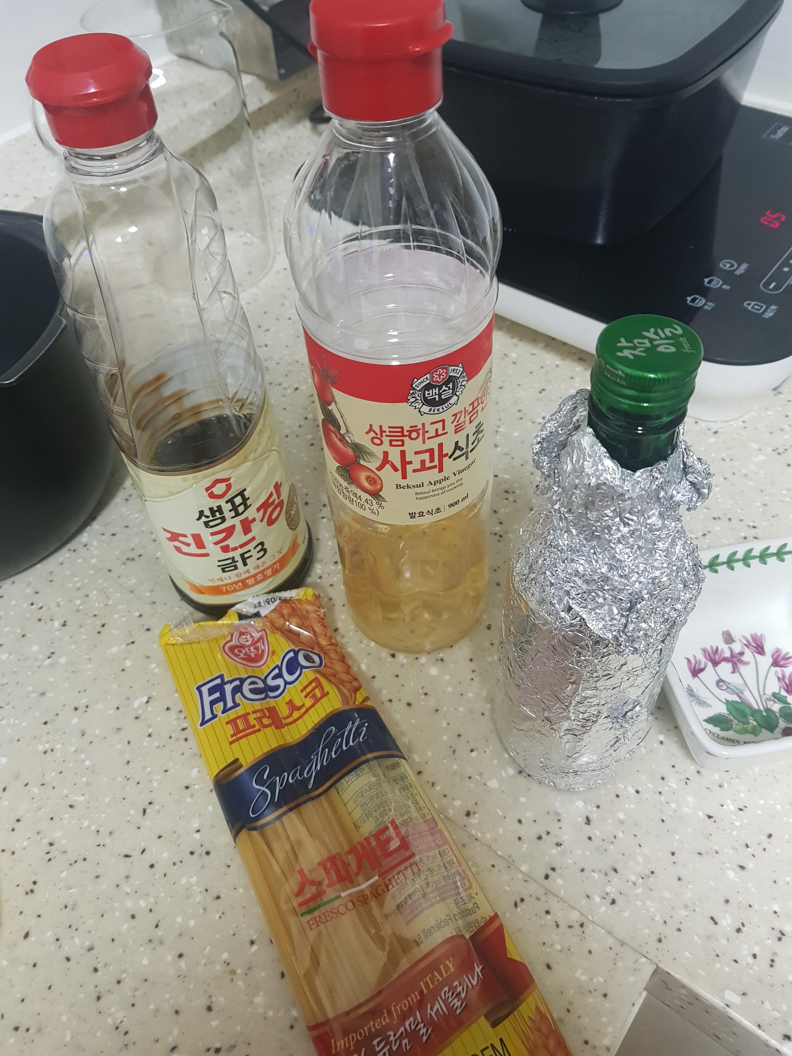 참기름, 간장, 식초, 파스타면, 소고기 다짐육, 양파, 편마늘(없으면 다진 마늘), 굴소스