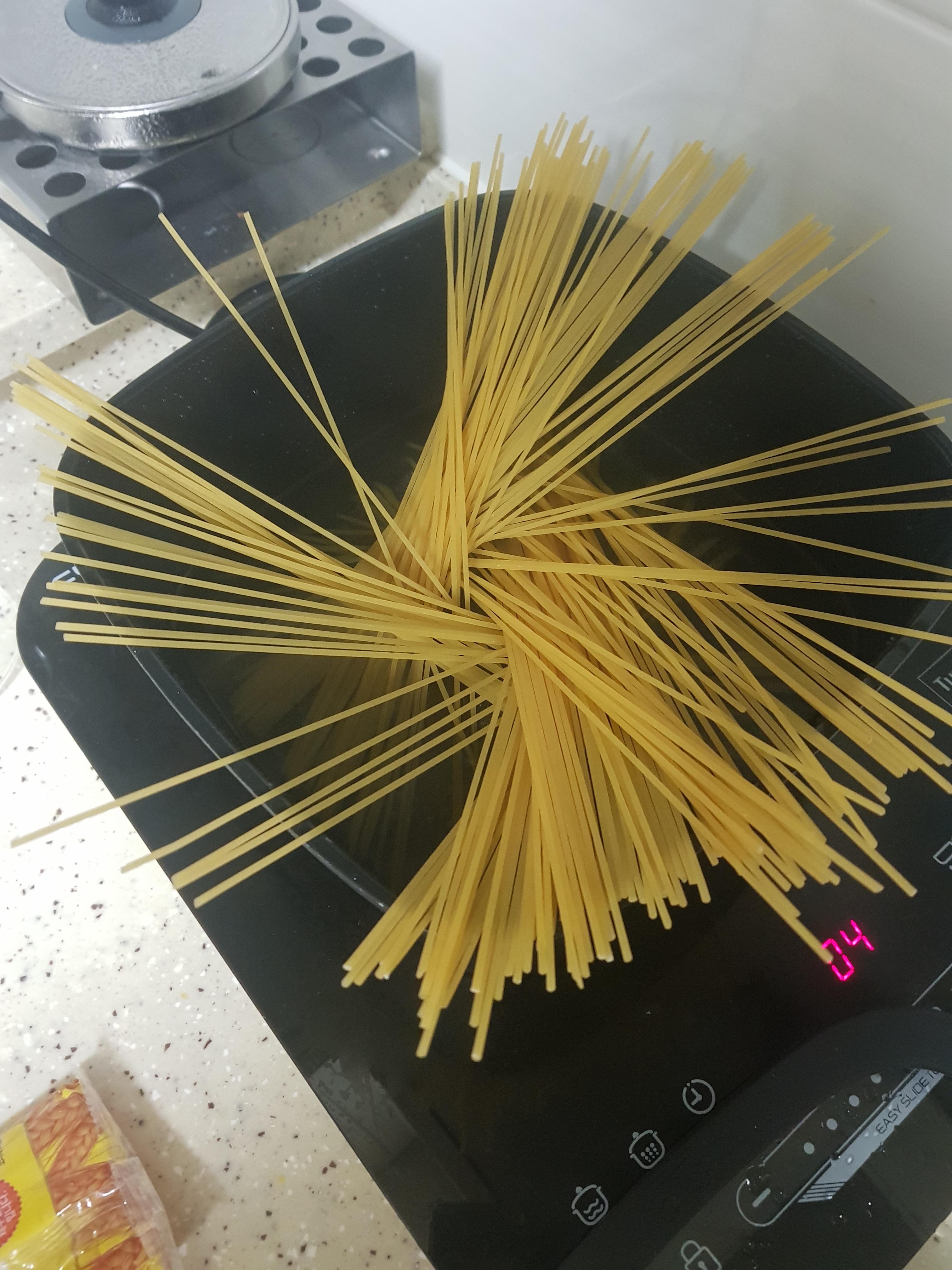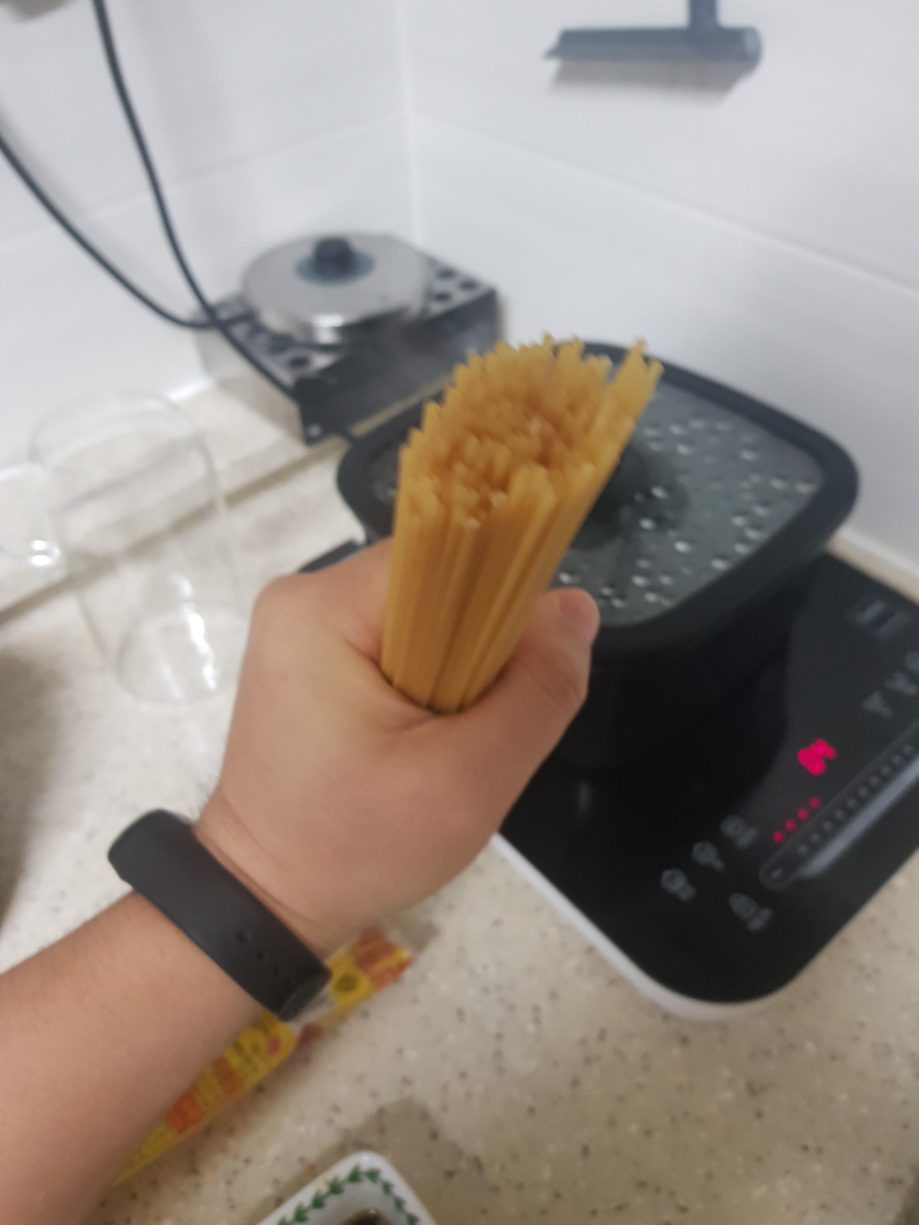 파스타면은 양손을 잡아서 왼손과 오른손을 서로 반대방향으로 비트시고 냄비에 놓아줍니다.