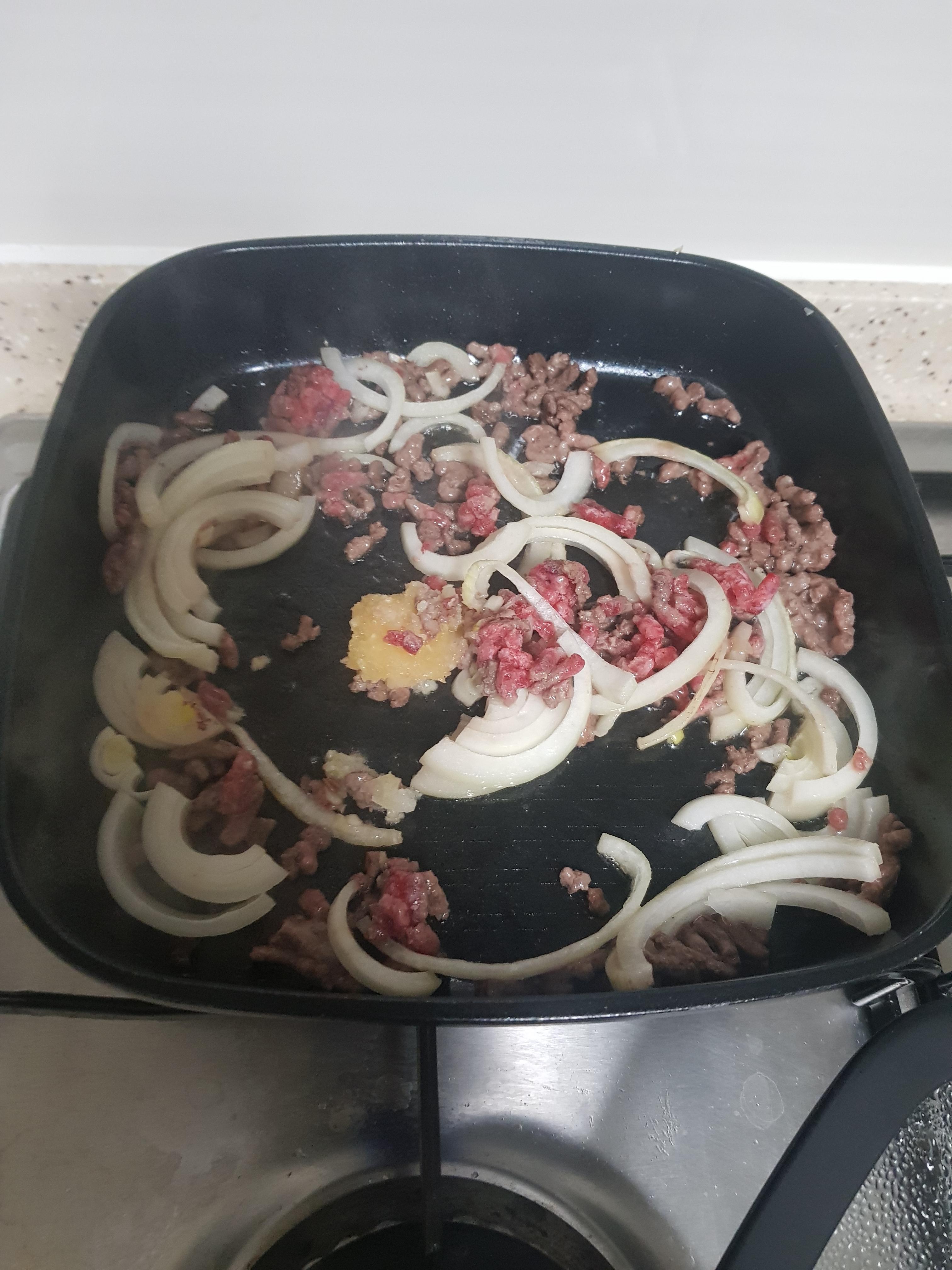 면을 삶는 동안 다진 소고기에 기름을 두르고 양파를 넣어줍니다.