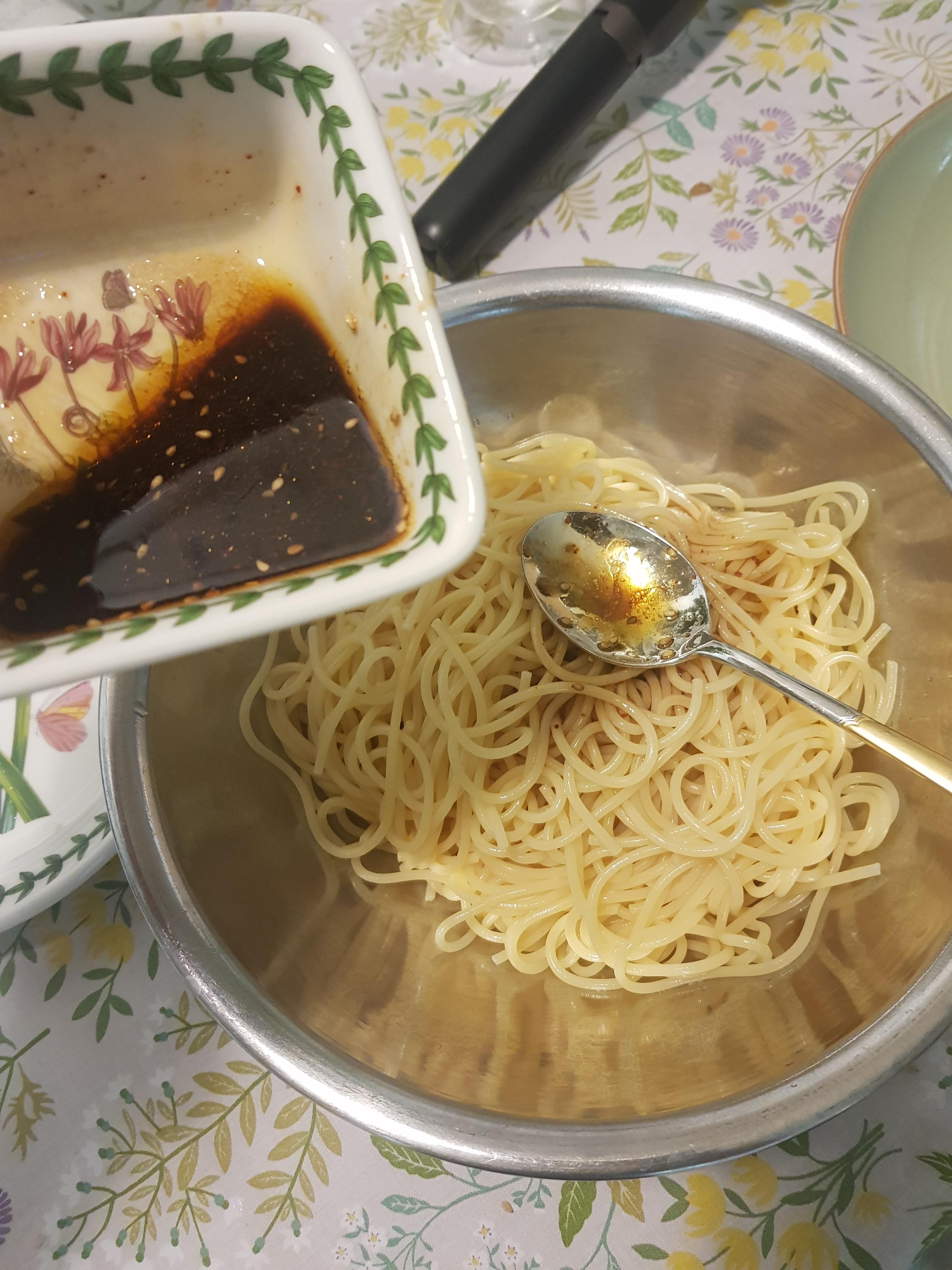 물기를 제거하고 차가워진 파스타면에 준비된 소스를 부어줍니다.