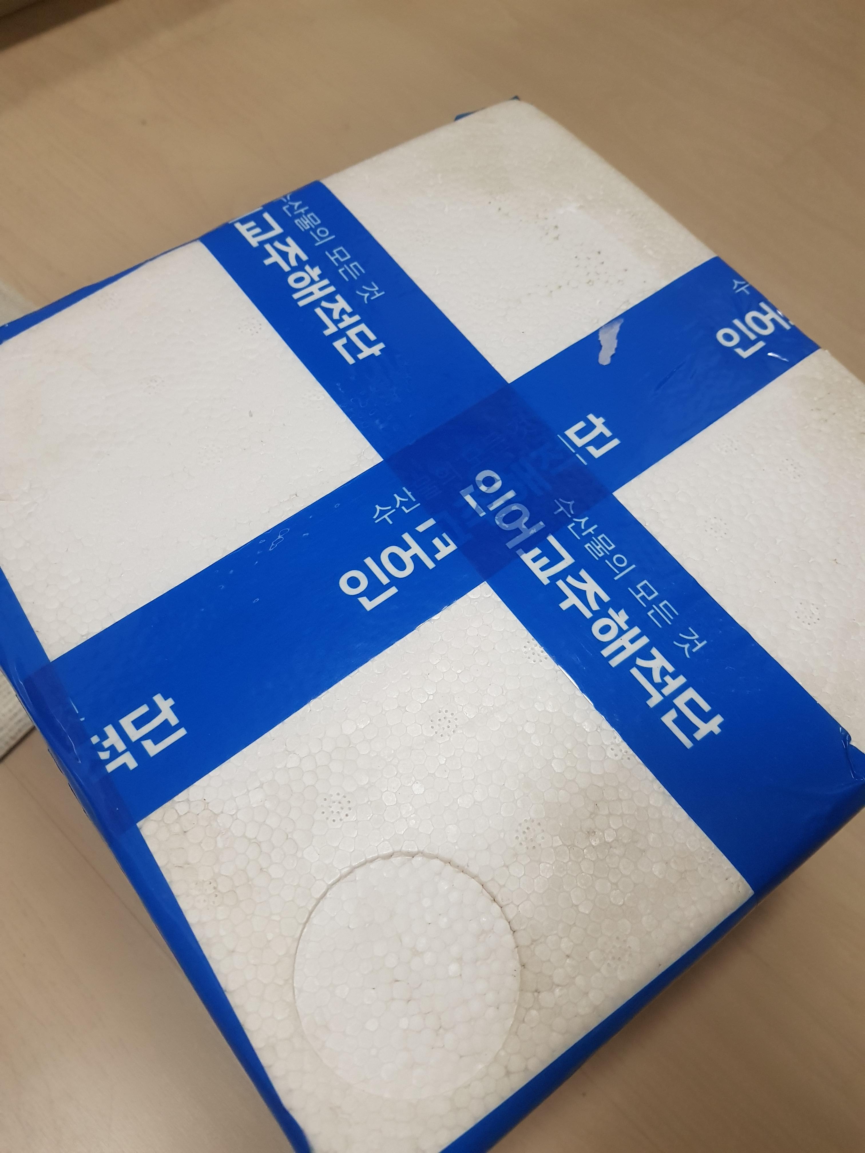 배송된 스티로폼 박스에 인어교주해적단 파란 테이프가 눈에 확 들어옵니다