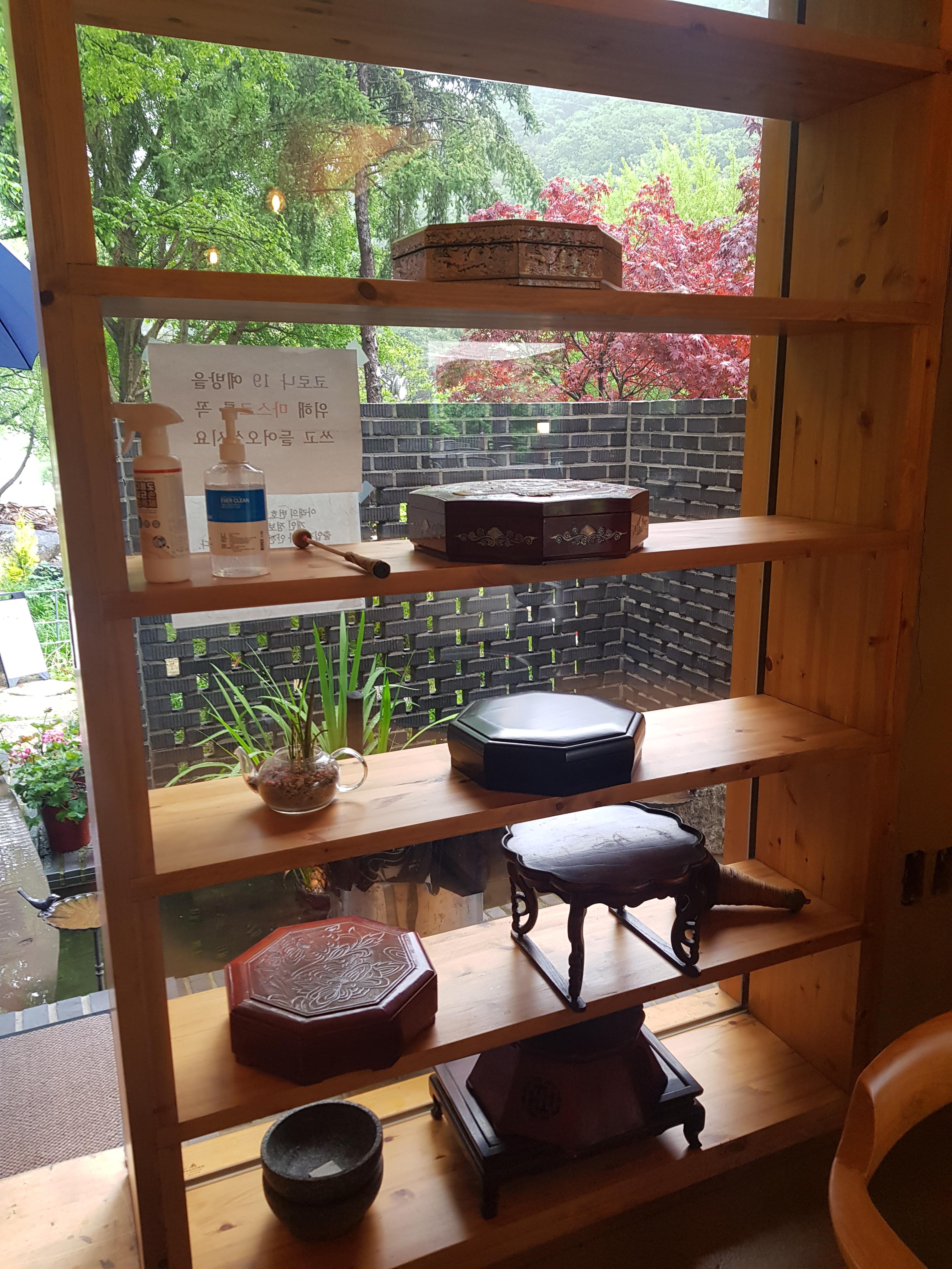 그리고 입구 바로 옆에는 목재로 만들어진 탁자와 보관함들이 이쁘게 배열되어 있어 전체적으로 고풍스런 떡카페 분위기와 잘 어울립니다