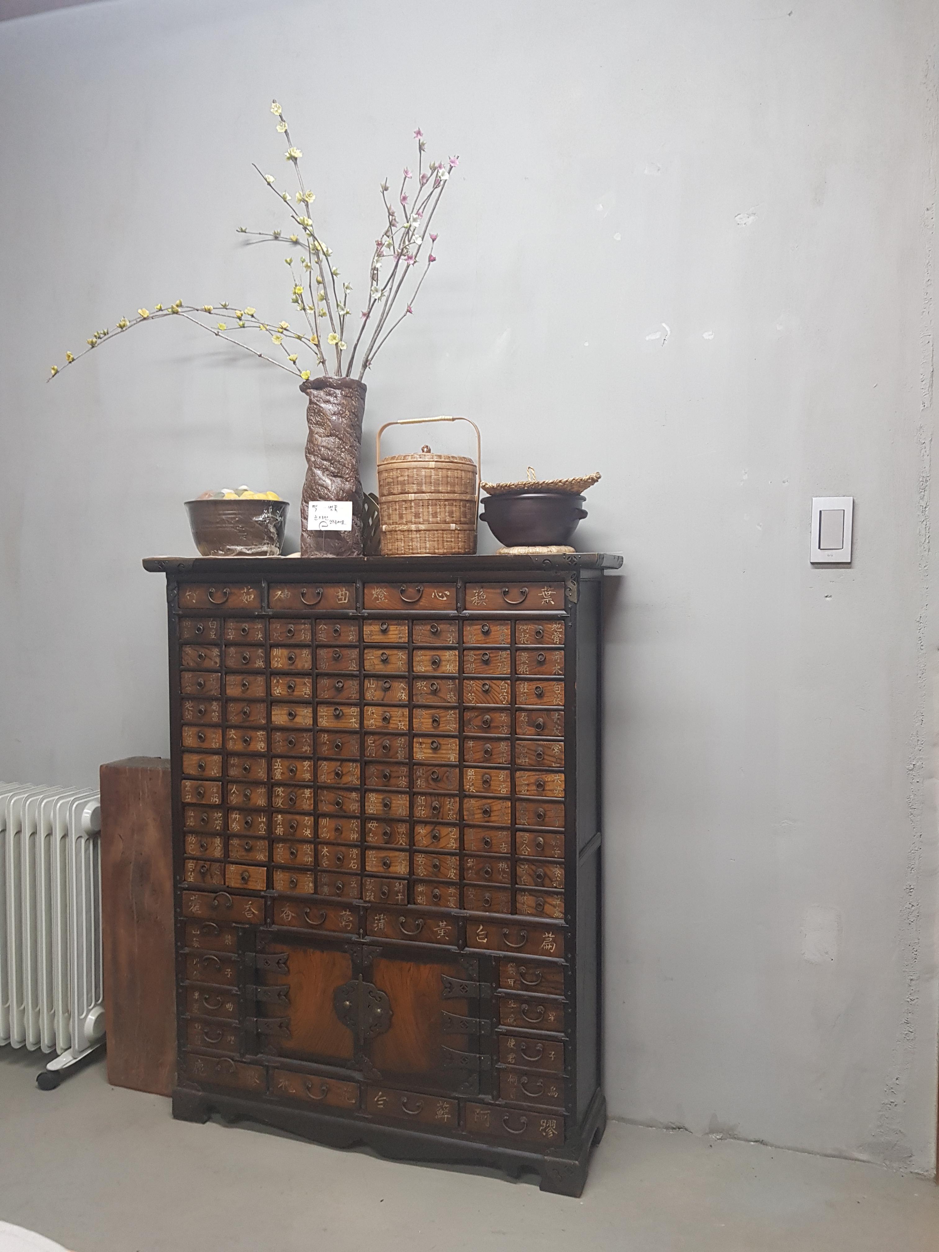 옛날 한약재를 담는것과 비슷한 인테리어 제품들이 눈길을 끕니다