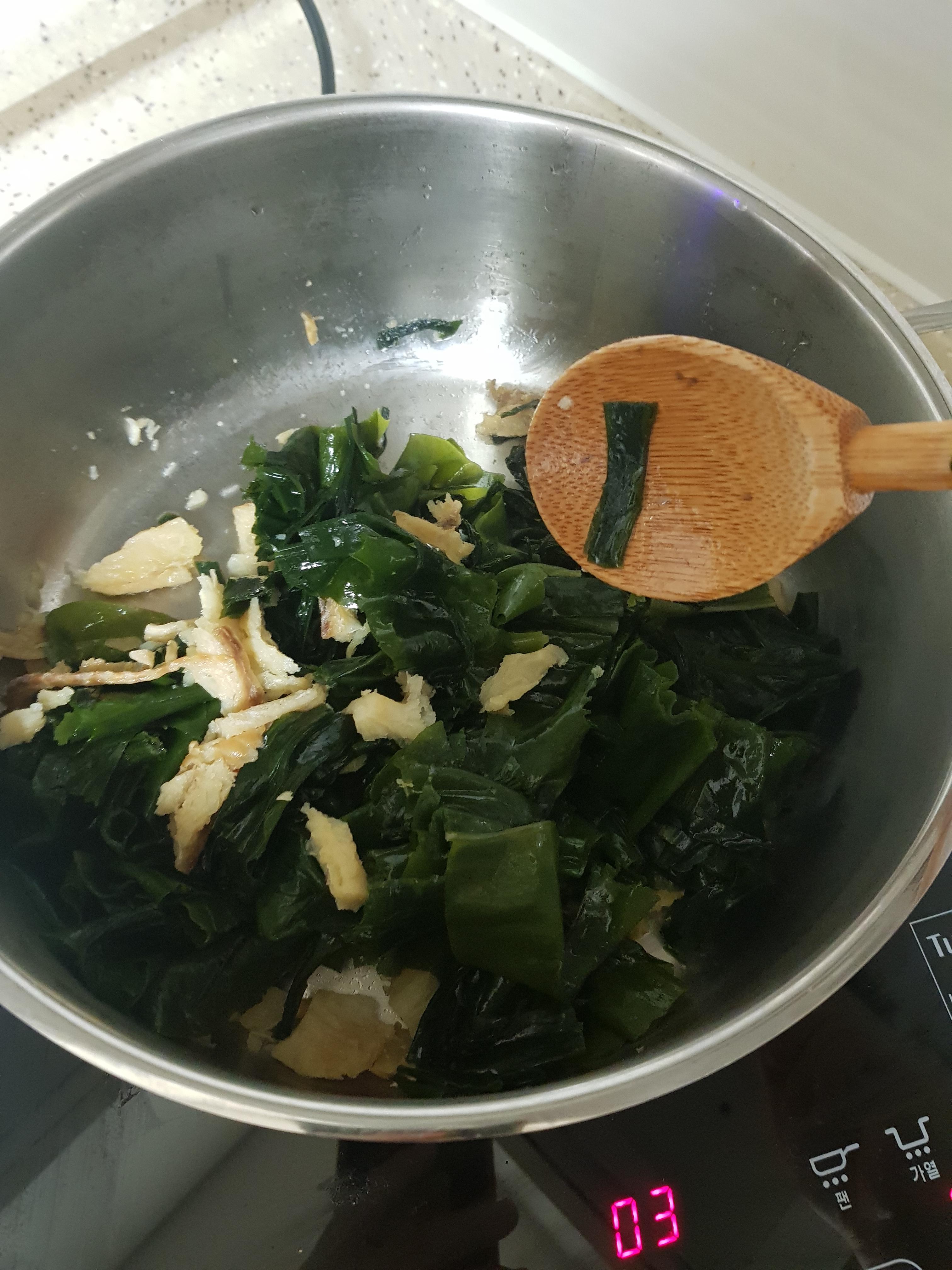다시 황태를 볶다가 미역을 같이 넣어주고 볶아주세요