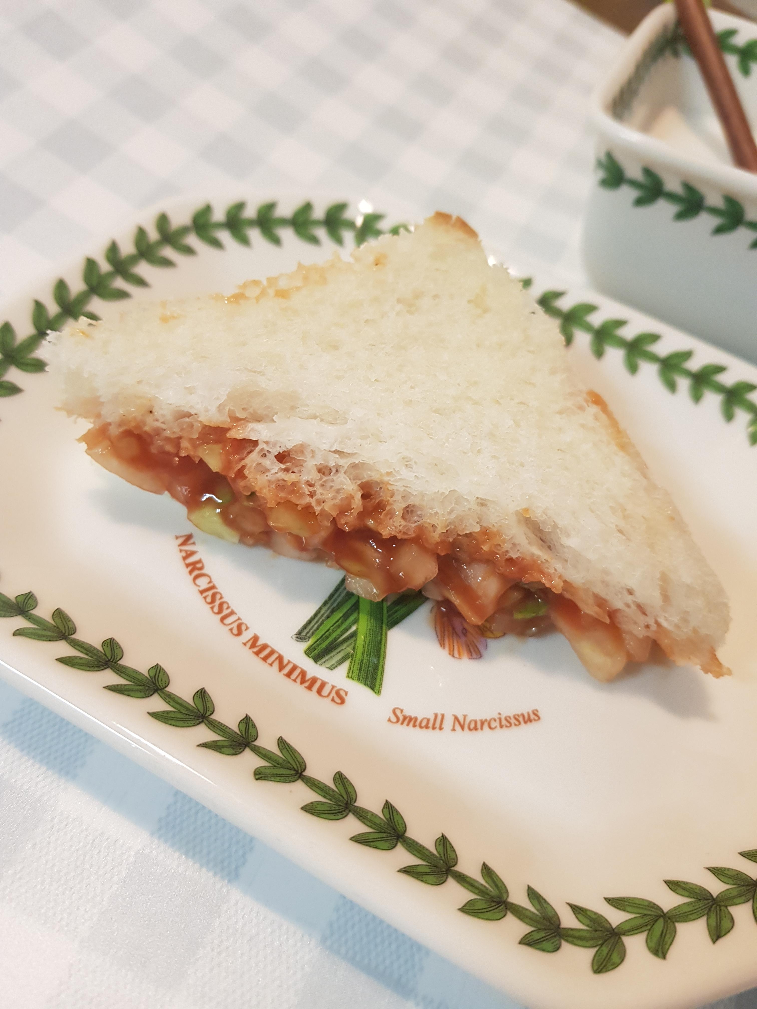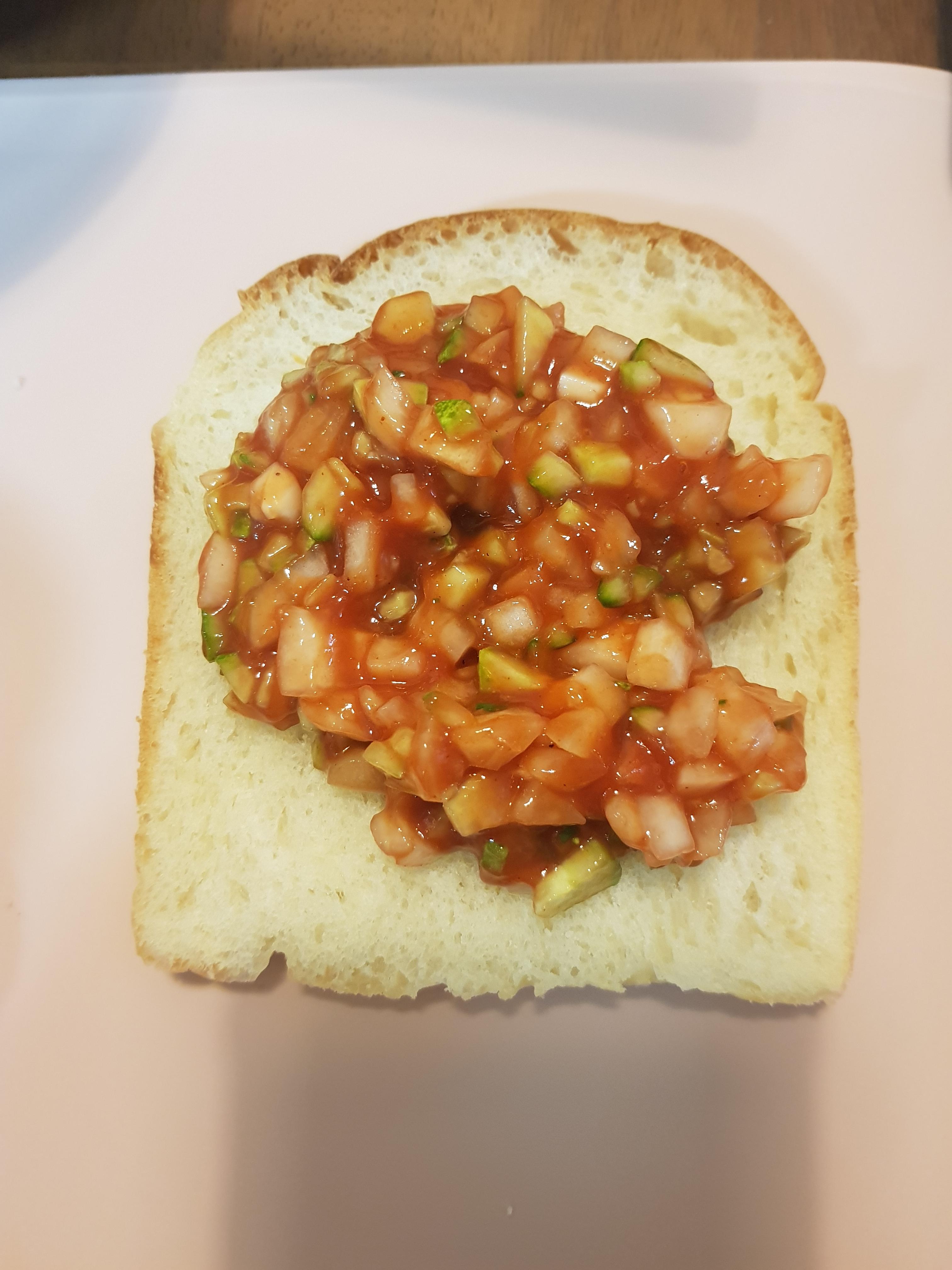 그다음으로 식빵을 준비해주시고 그위에 잘 섞어진 속재료를 올려주면 끝 입니다