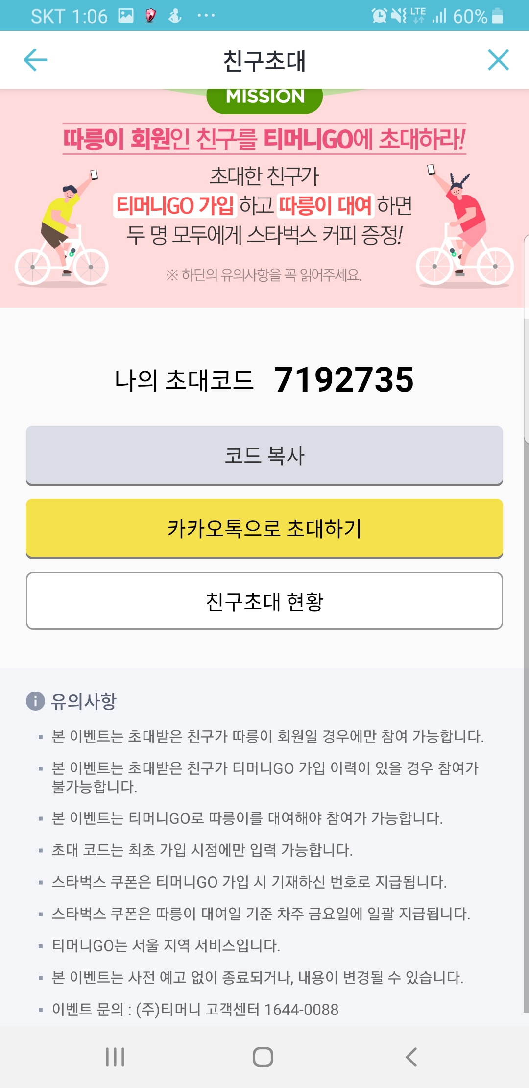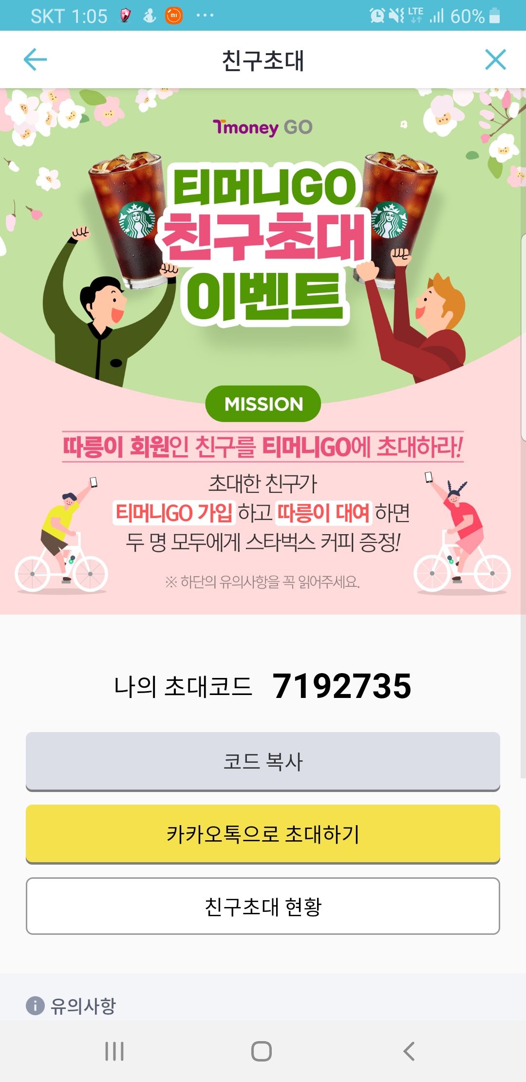 티머니GO로 따릉이 타면 스타벅스 쿠폰이 두장~을 준다고 합니다