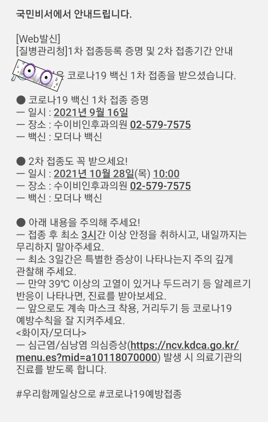 이상 2021년 9월 16일 코로나19 모더나1차 접종 후기를 남깁니다~^^