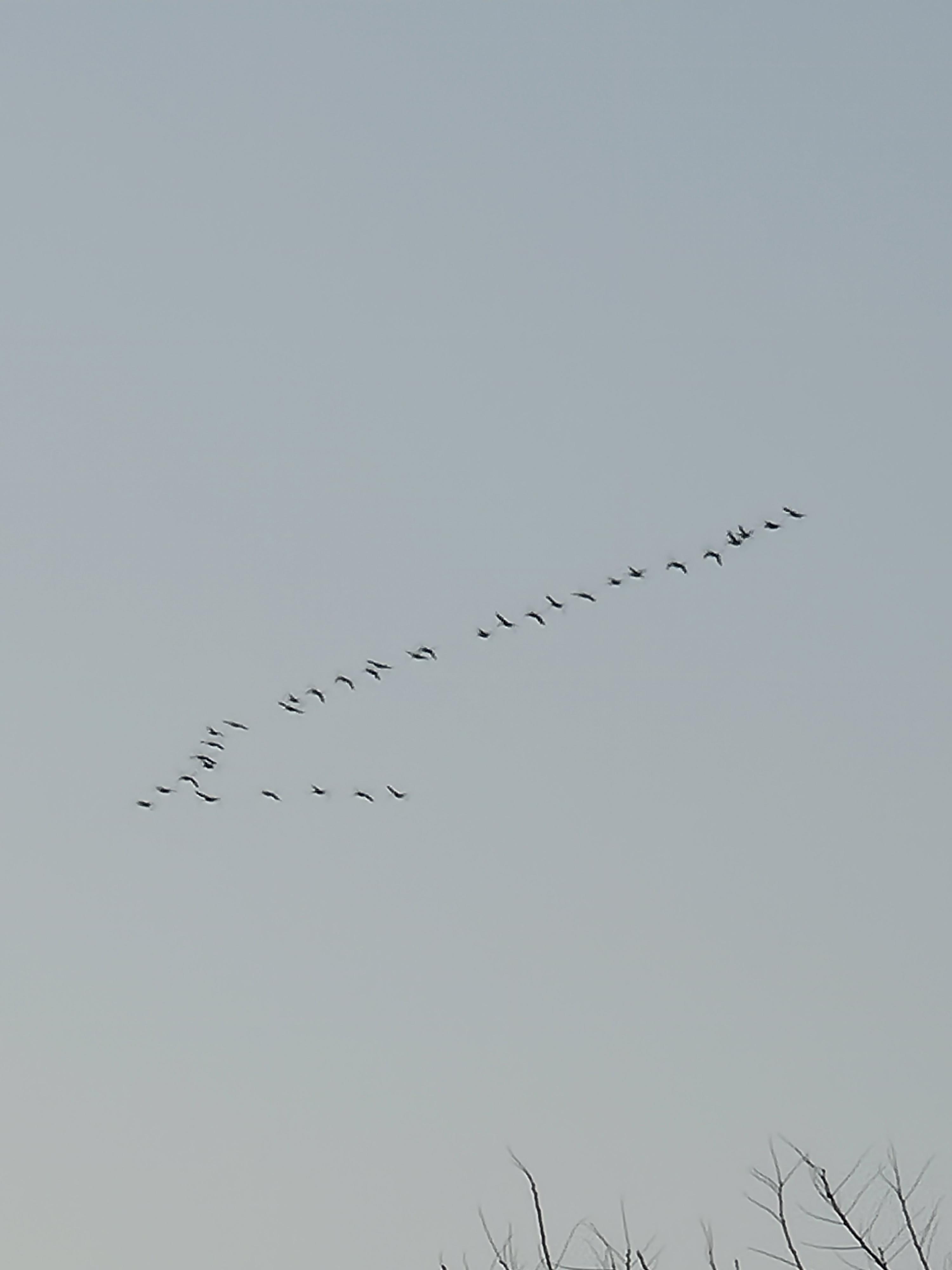 본능에 따른 학익진으로 이동하는 철새들
