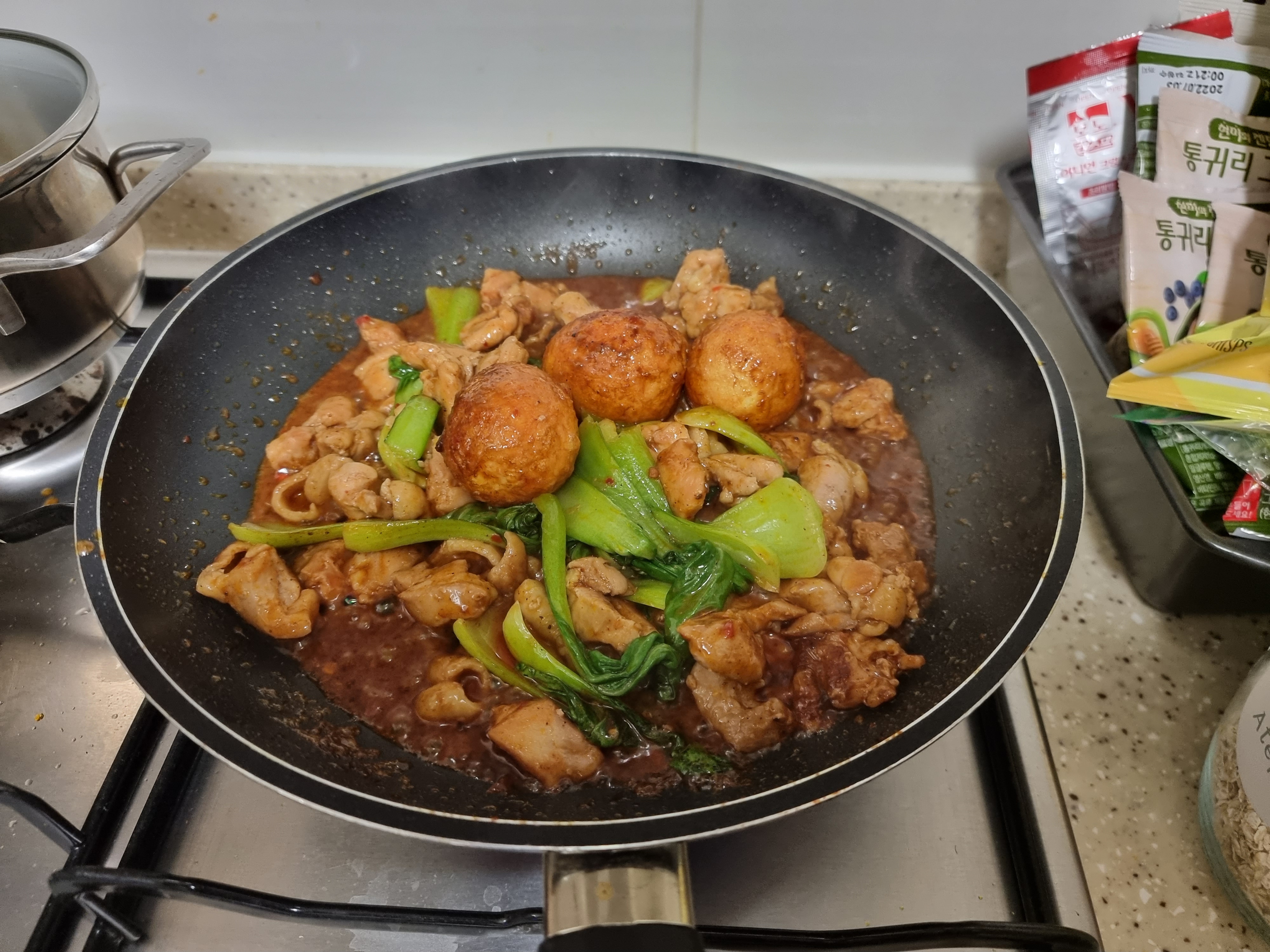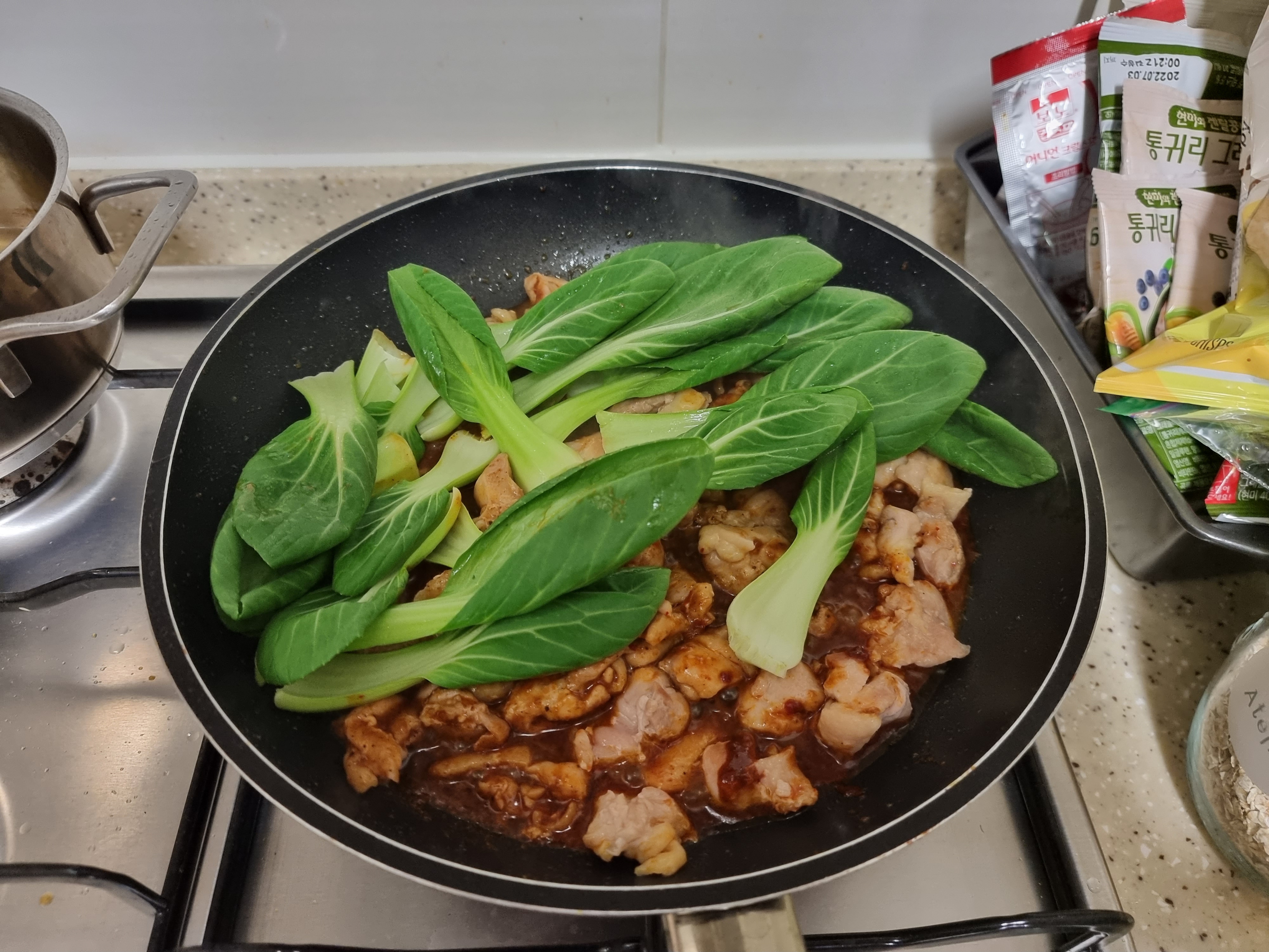 프라이팬에 볶다가 소스와 청경채를 넣습니다