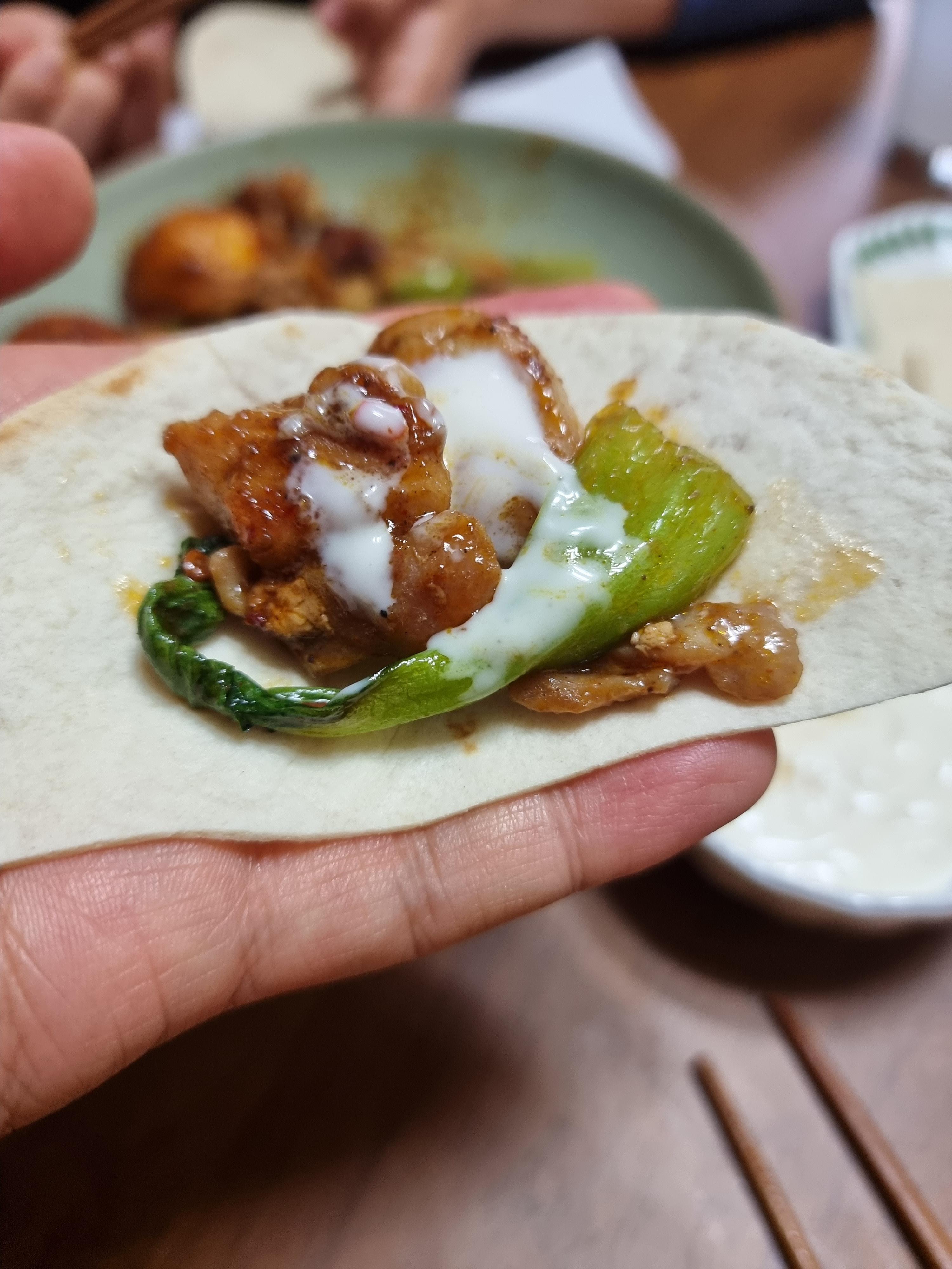 또띠아에 마라닭과 마요네즈 소스를 찍어봅니다