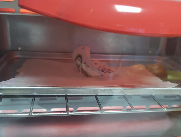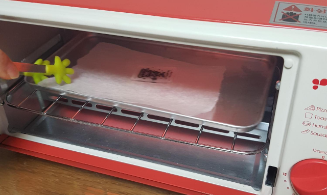 슈링클스를 구울 때는 최소 150℃는 되어야 한다. 적정 온도를 유지해야 하기 때문에 드라이기로 작업하다가는 실패한 결과물이 나올 수도 있다. 또한 전자레인지의 경우, 직접적인 열기가 아닌 파동으로 따뜻하게 만드는 원리이기 때문에 아무 변화도 일어나지 않는다. 그래서 우리는 미니 오븐을 사용했습니다.