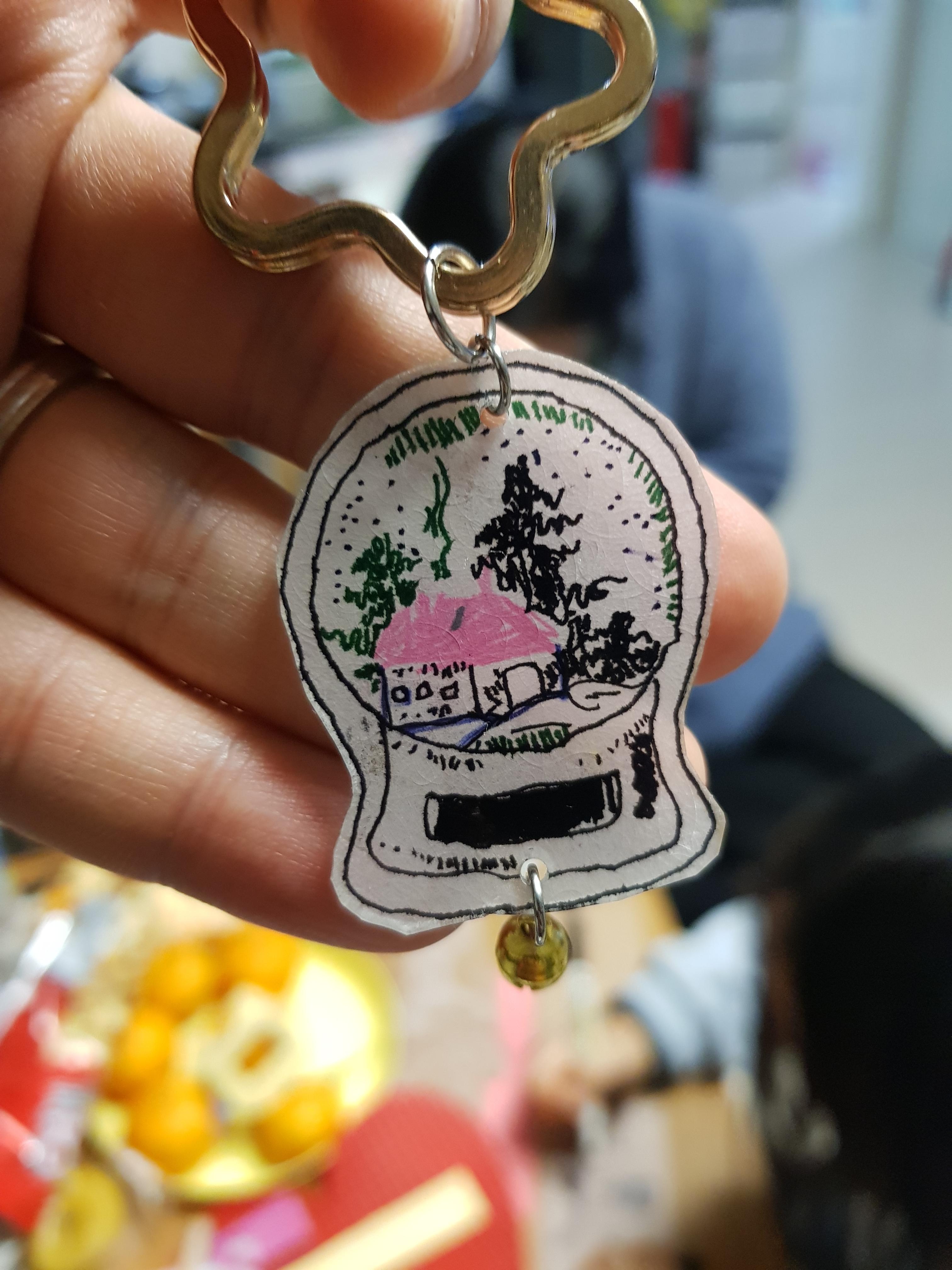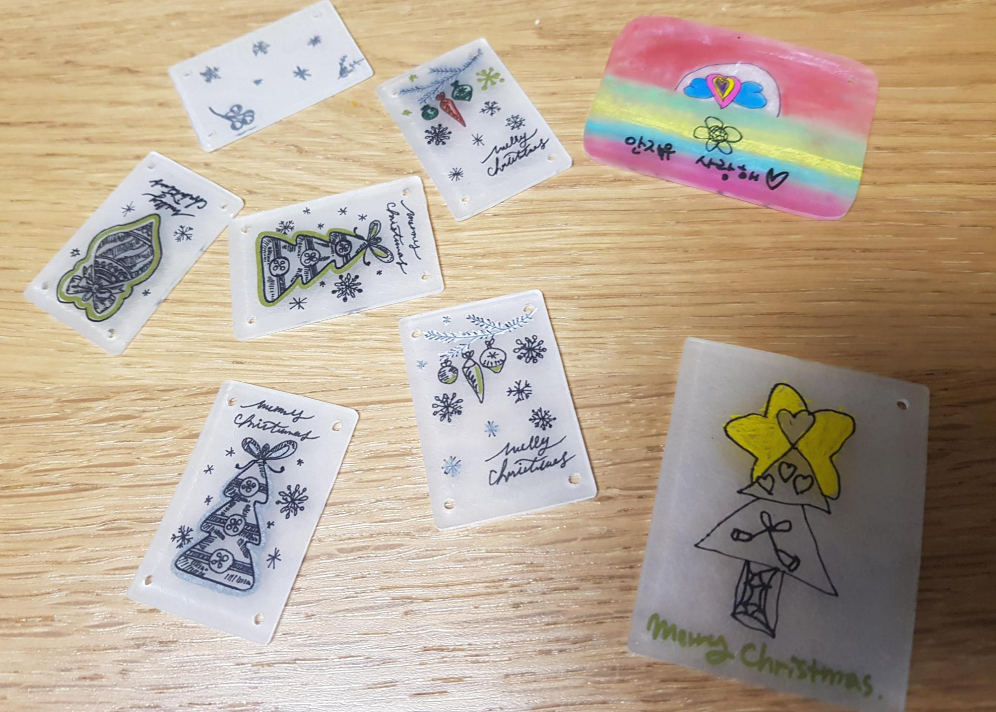 이렇게 슈링클스 종이에 밑그림을 그립니다. 그런데 여기서 슈링클스 종이에 그림을 그릴 때는 어떤 펜을 사용해야 할까요? 연필? 크레파스? 사인펜? 네임펜? 슈링클스 공예는 온도가 가해지기 때문에 열에 의한 변화가 큰 채색 용품은 피해야 한다. 그럼 대충 어떤 걸 써야 할지 아시겠죠? 저희는 우선 네임펜으로 그림을 그리고 색칠을 했습니다.
