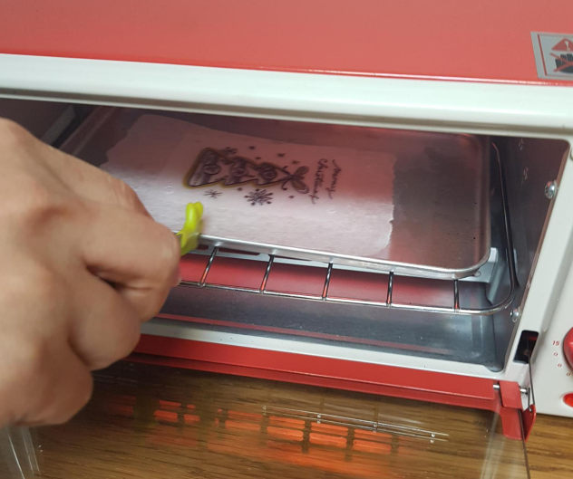 슈링클스를 구울 때는 최소 150℃는 되어야 한다. 적정 온도를 유지해야 하기 때문에 드라이기로 작업하다가는 실패한 결과물이 나올 수도 있다. 또한 전자레인지의 경우, 직접적인 열기가 아닌 파동으로 따뜻하게 만드는 원리이기 때문에 아무 변화도 일어나지 않는다. 그래서 우리는 미니 오븐을 사용했습니다.