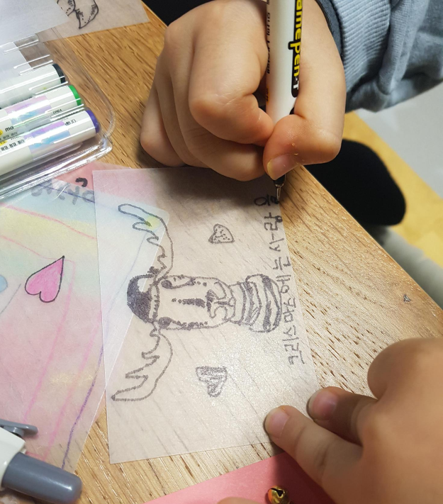 이렇게 슈링클스 종이에 밑그림을 그립니다. 그런데 여기서 슈링클스 종이에 그림을 그릴 때는 어떤 펜을 사용해야 할까요? 연필? 크레파스? 사인펜? 네임펜? 슈링클스 공예는 온도가 가해지기 때문에 열에 의한 변화가 큰 채색 용품은 피해야 한다. 그럼 대충 어떤 걸 써야 할지 아시겠죠? 저희는 우선 네임펜으로 그림을 그리고 색칠을 했습니다.