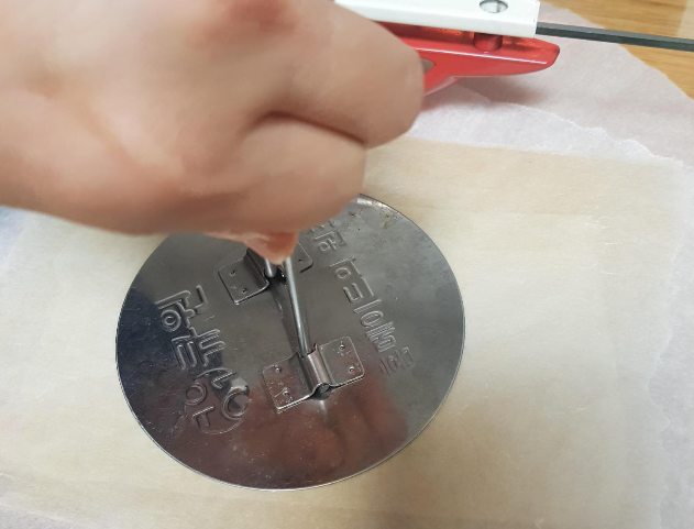 다 줄어든 슈링클스를 집게로 집어서 혹시나 몰라 꾹꾹 펴주었습니다. 장비는 집에 있는 호떡 만들 때 사용하는 그 눌러주는 장비입니다.