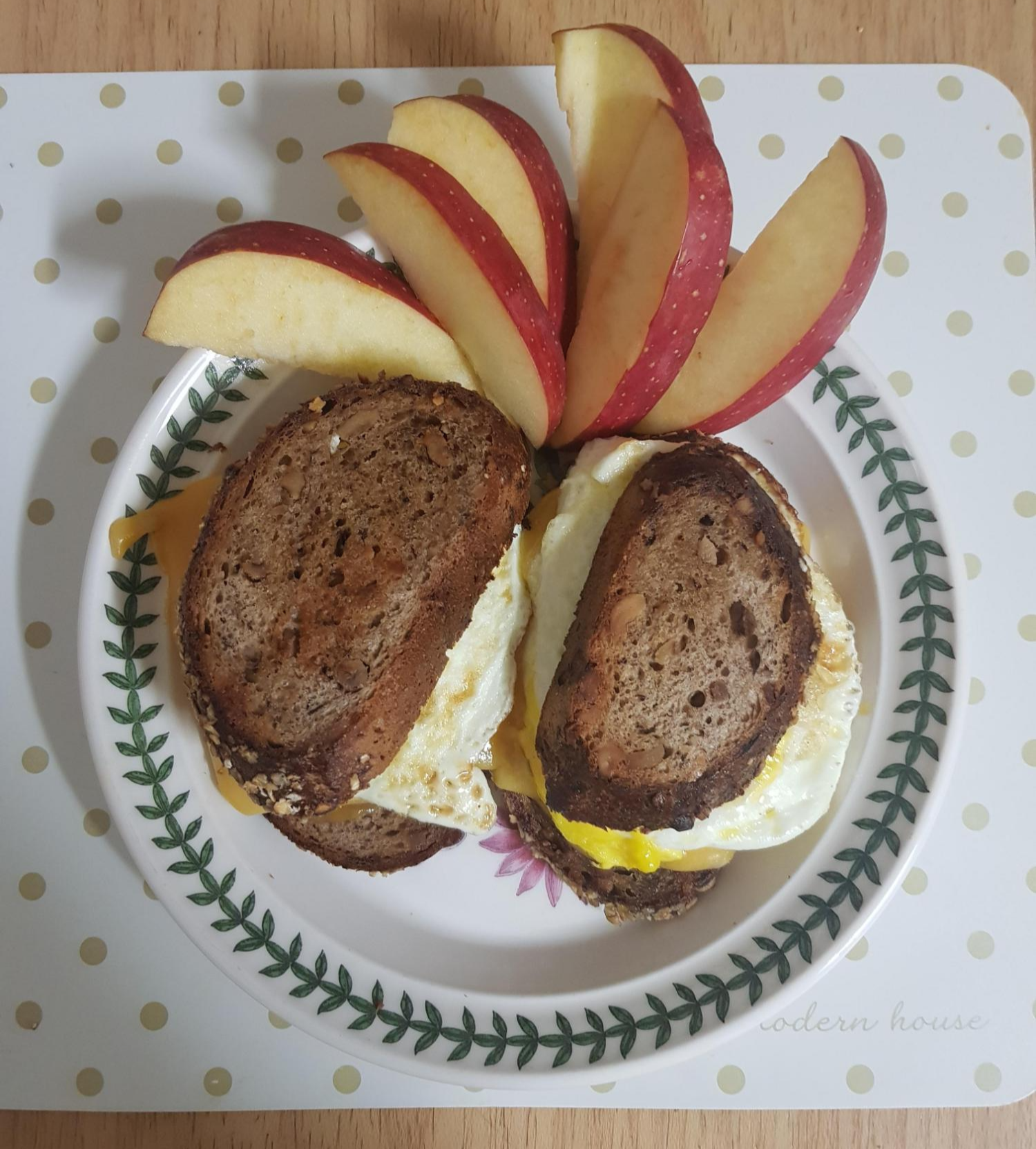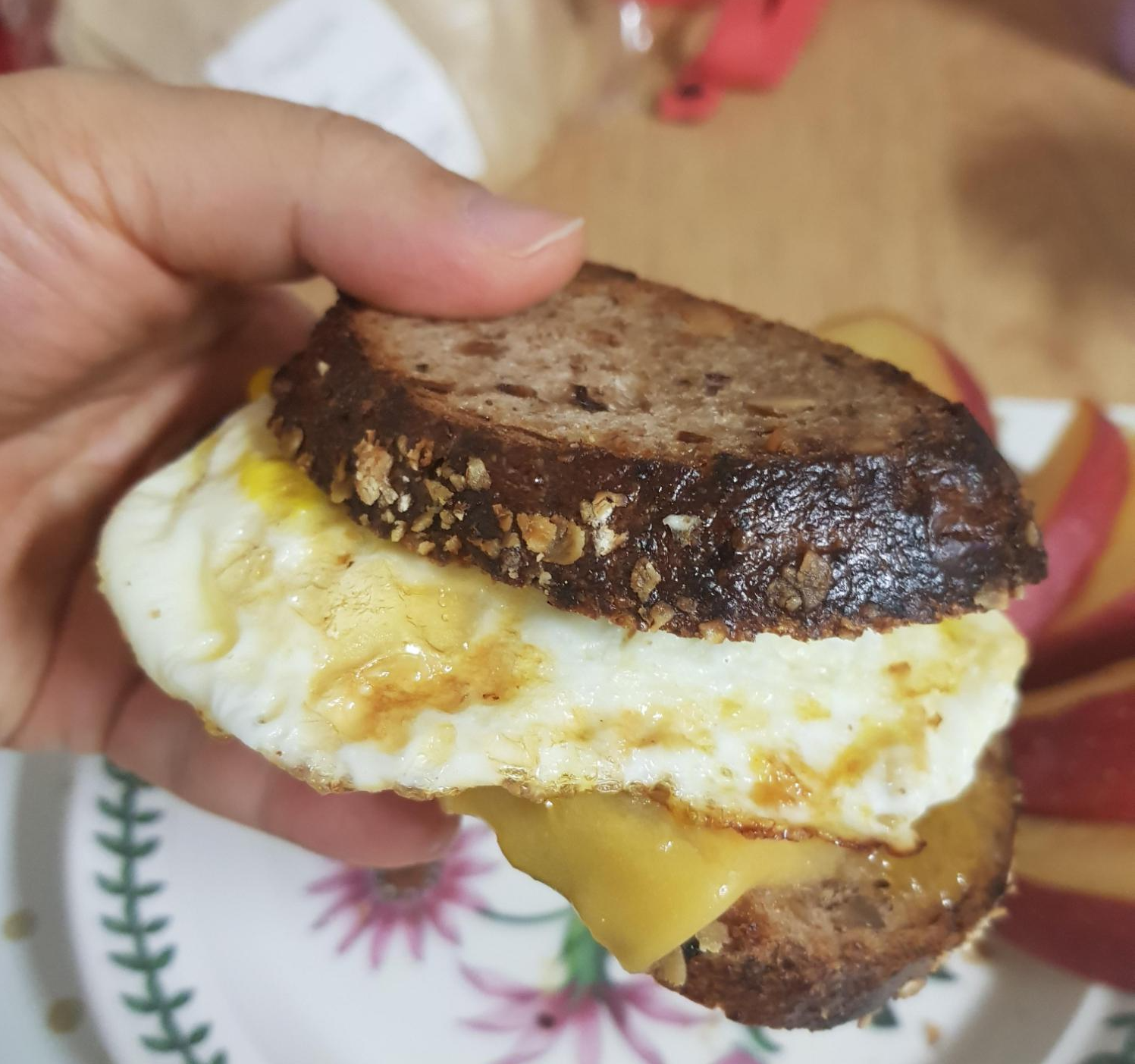 계란 프라이가 다 익어갈때즘 빵도 다 구워졌습니다. 빵 위에 치즈 그리고 계란 프라이 올려놓고 그위에 준비한 복숭아 잼을 발랐습니다. 쨈도 개인의 취향에 맞게 여러 가지 준비하셔도 됩니다.