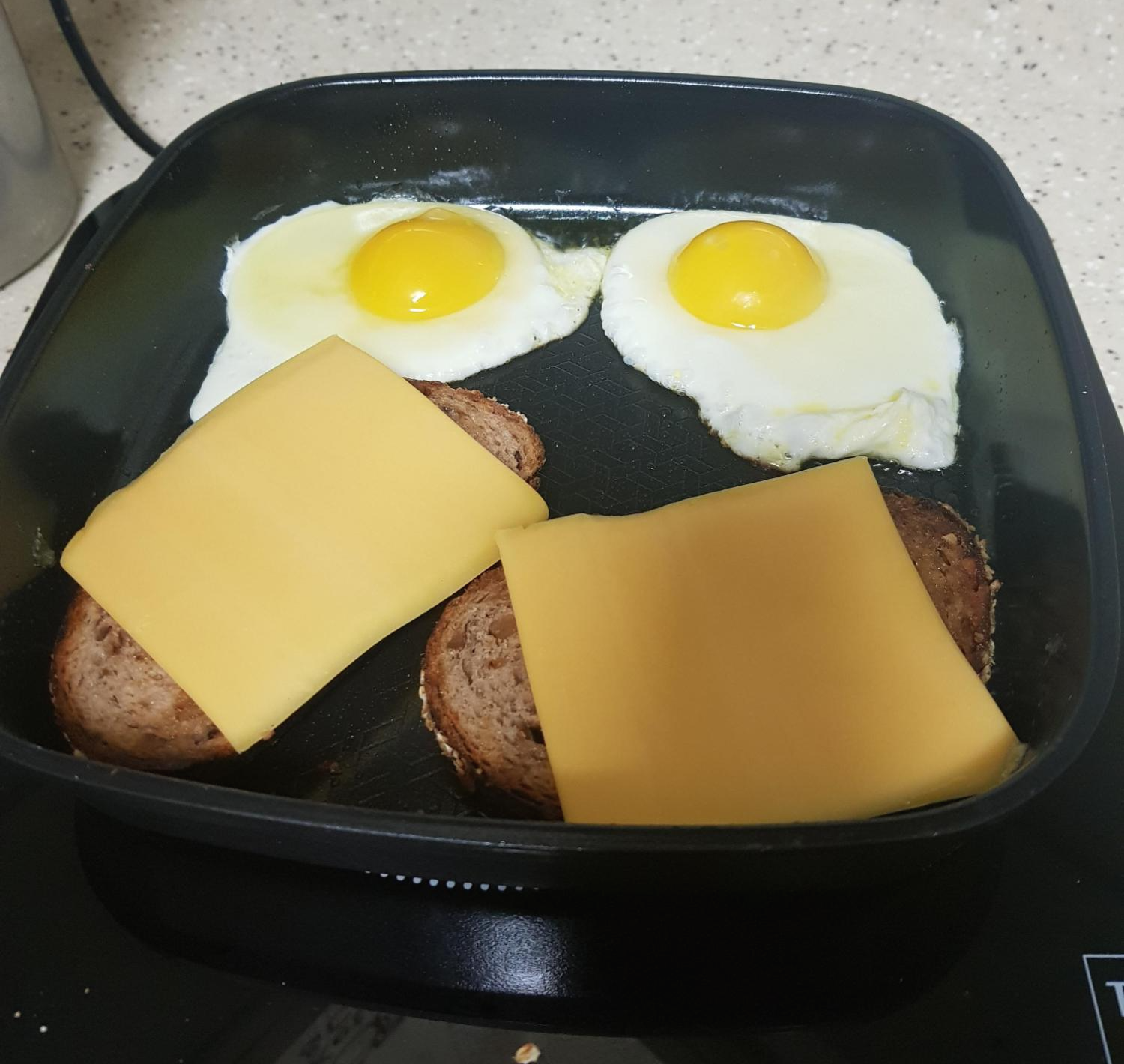 계란 프라이가 익는 동안에 2개의 빵조각을 굽고 다시 2개의 빵조각을 구우면서 치즈까지 올려 놓습니다.