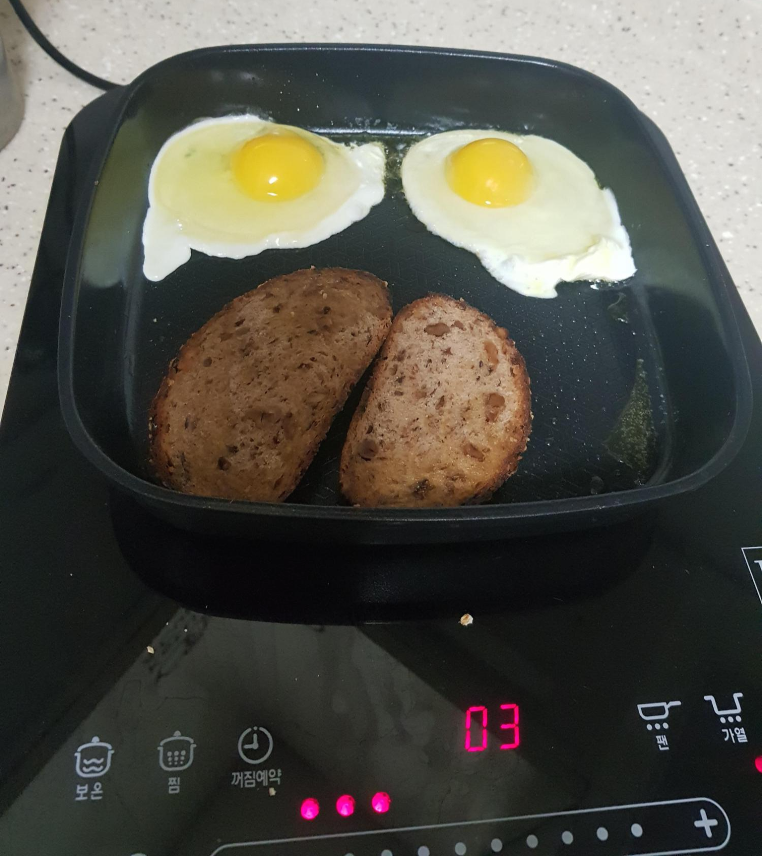 제가 원하는 식감의 빵을 굽는데 걸리는 시간은 한쪽 면당 40~50초 걸린듯합니다. 인덕션의 세기 3으로 했습니다. 위에서도 언급했지만 개인 취향임으로 알아서 구워주시면 됩니다.