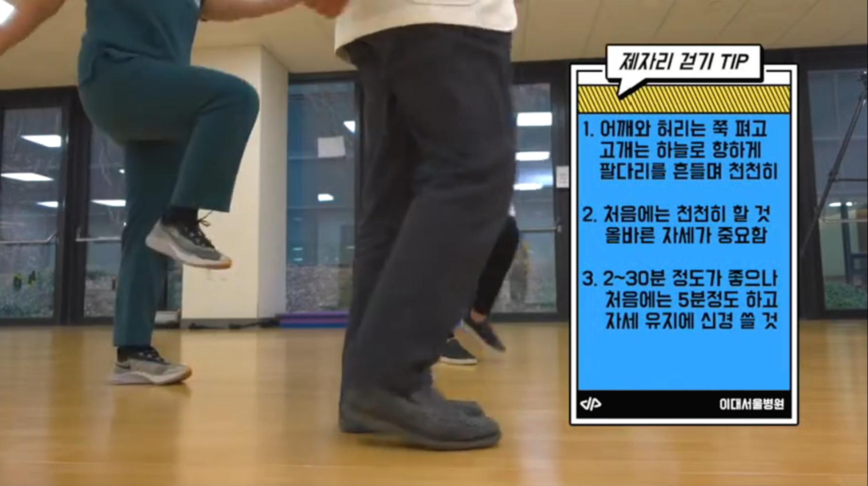 본격적인 운동에 앞서 몸풀기 준비 운동을 해야겠죠. 그건 바로 걷기 그것도 제자리 걷기