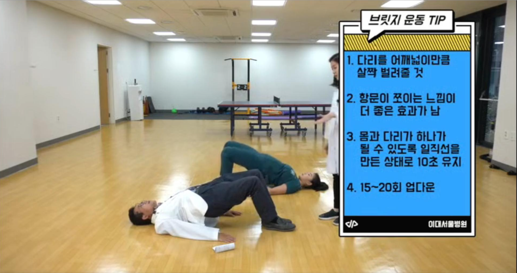 브리지 운동은 엉덩이에 힘이 들어가는 게 포인트입니다. 허리를 사용하지 마시고 엉덩이에 힘주시고 들어주세요. 그리고 일직선 상태에서 멈추어 유지를 잘해주셔야 합니다. 여기서도 자세가 중요합니다. 처음에는 힘드니깐 자세만 잡는 연습 하시고 익숙해지시면 멈춤 시간을 1초에서 3초 5초 10초 늘려주시면 됩니다.
