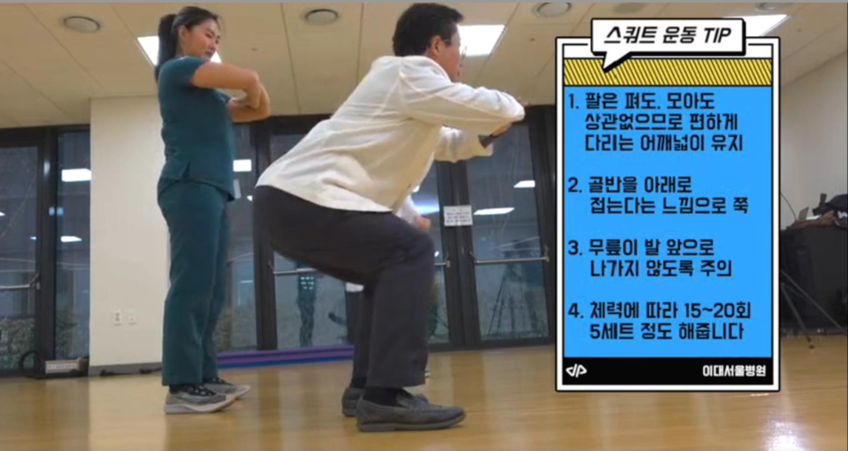 두 번째는 다들 한번쯤은 들어본 스쿼트운동 입니다. 보통 그냥 앉았다 일어섰다가 하는거 아니야 하는데 그냥하면 무릎도 허리에도 않좋은 운동이 될 수 있다는거 명심하세요.
