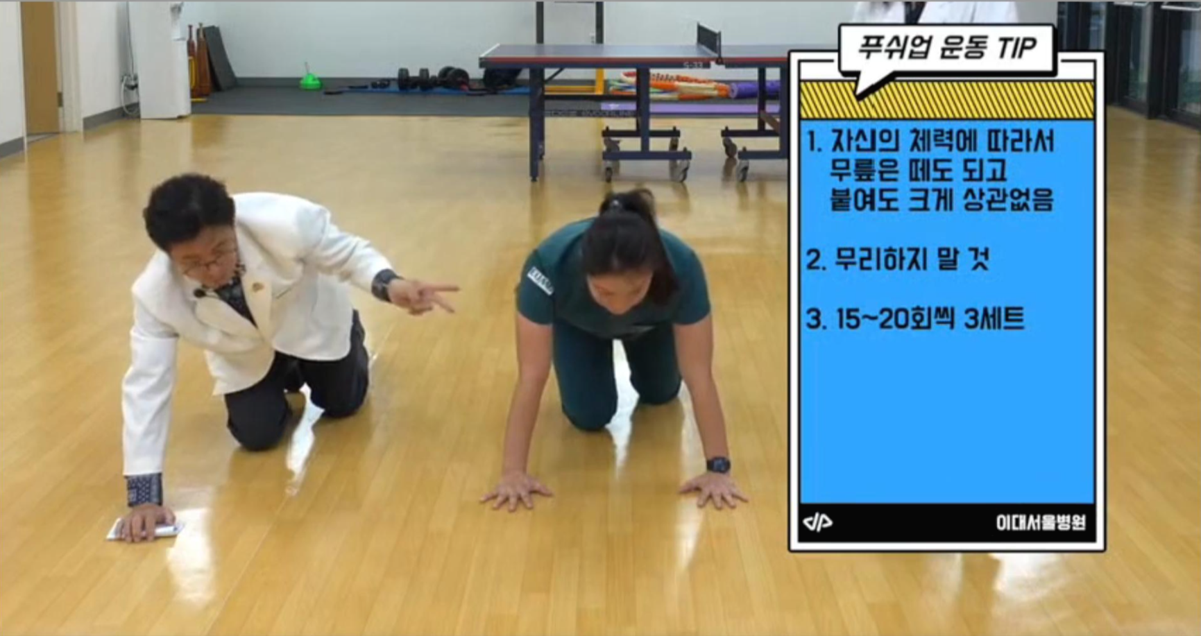 상체운동까지 하니 팔까지 떨리시죠~ 푸쉬업 운동은 너무 무리하게 하시면 팔목도 안 좋아질 수 있습니다. 그럴 땐 의자나 책상을 잡고 45도 기울기로 무리하시지 않게 운동하셔도 됩니다.