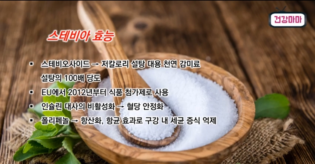 1. 스테비오사이드 -> 저칼로리 설탕 대용 천연 감미료로 설탕의 100배 당도