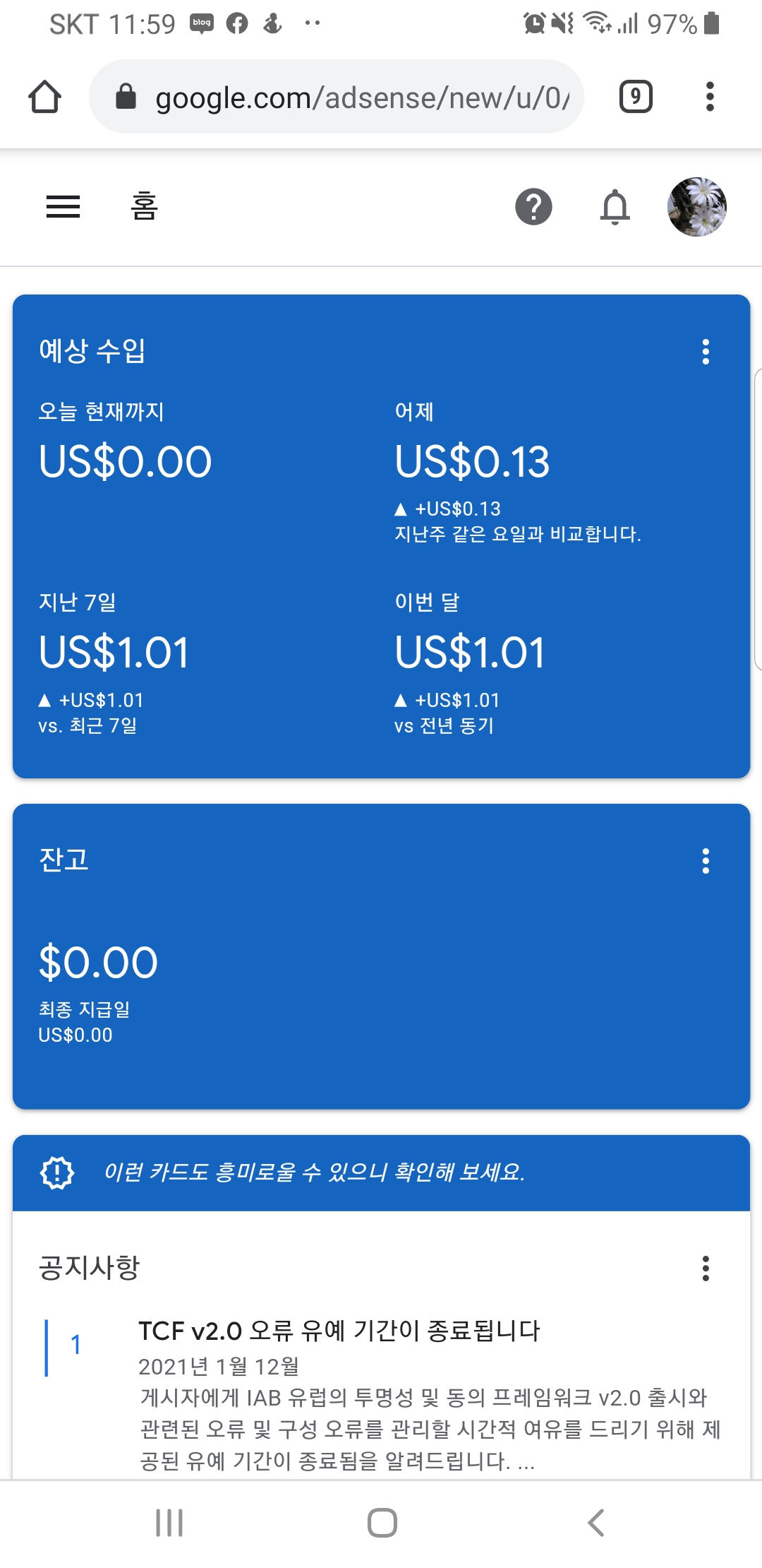 기존에 수입은 다 사라지고 다시 일주일간 1$ 수입~
