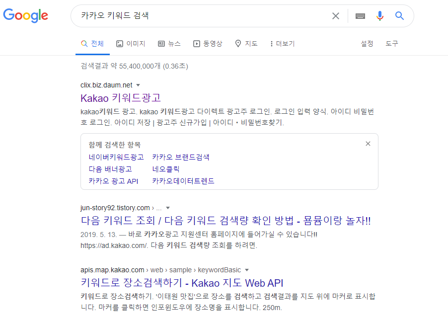 티스토리는 다음 카카오에서 관리하니깐 키워드 검색도 카카오로 해야 할 거라 생각했습니다.