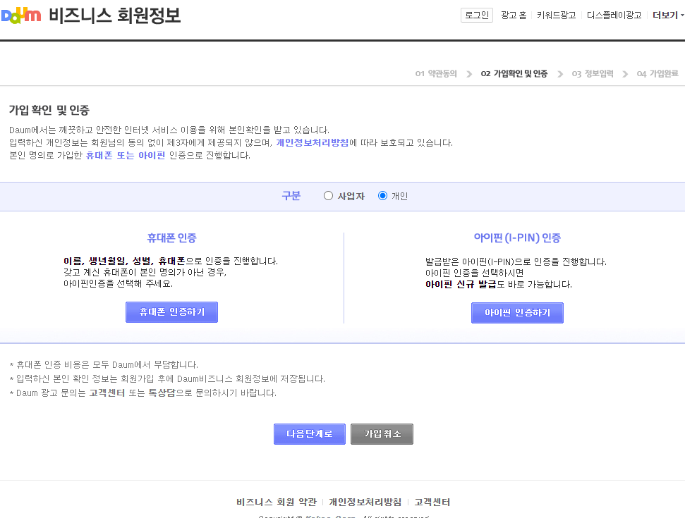 사업자는 사업자 선택, 저는 개인이니깐 개인 클릭 그리고 휴대폰으로 인증하기를 합니다.