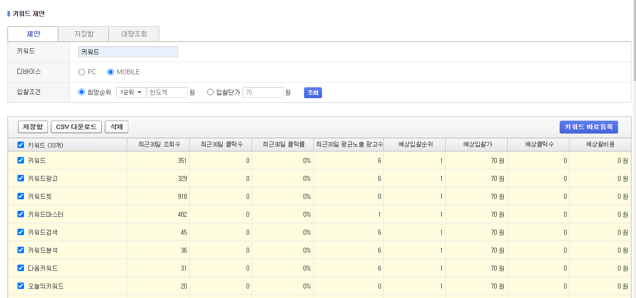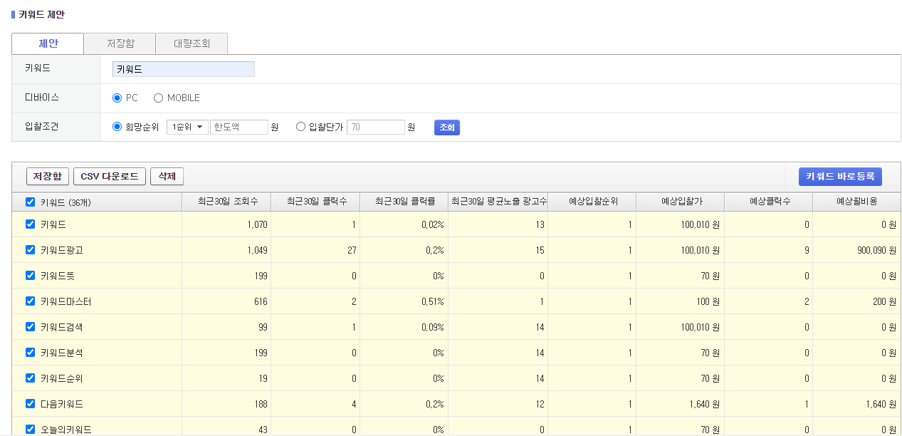 키워드 연관 단어들이 최근 30일간 얼마나 검색되고 클릭수 등이 나타납니다.