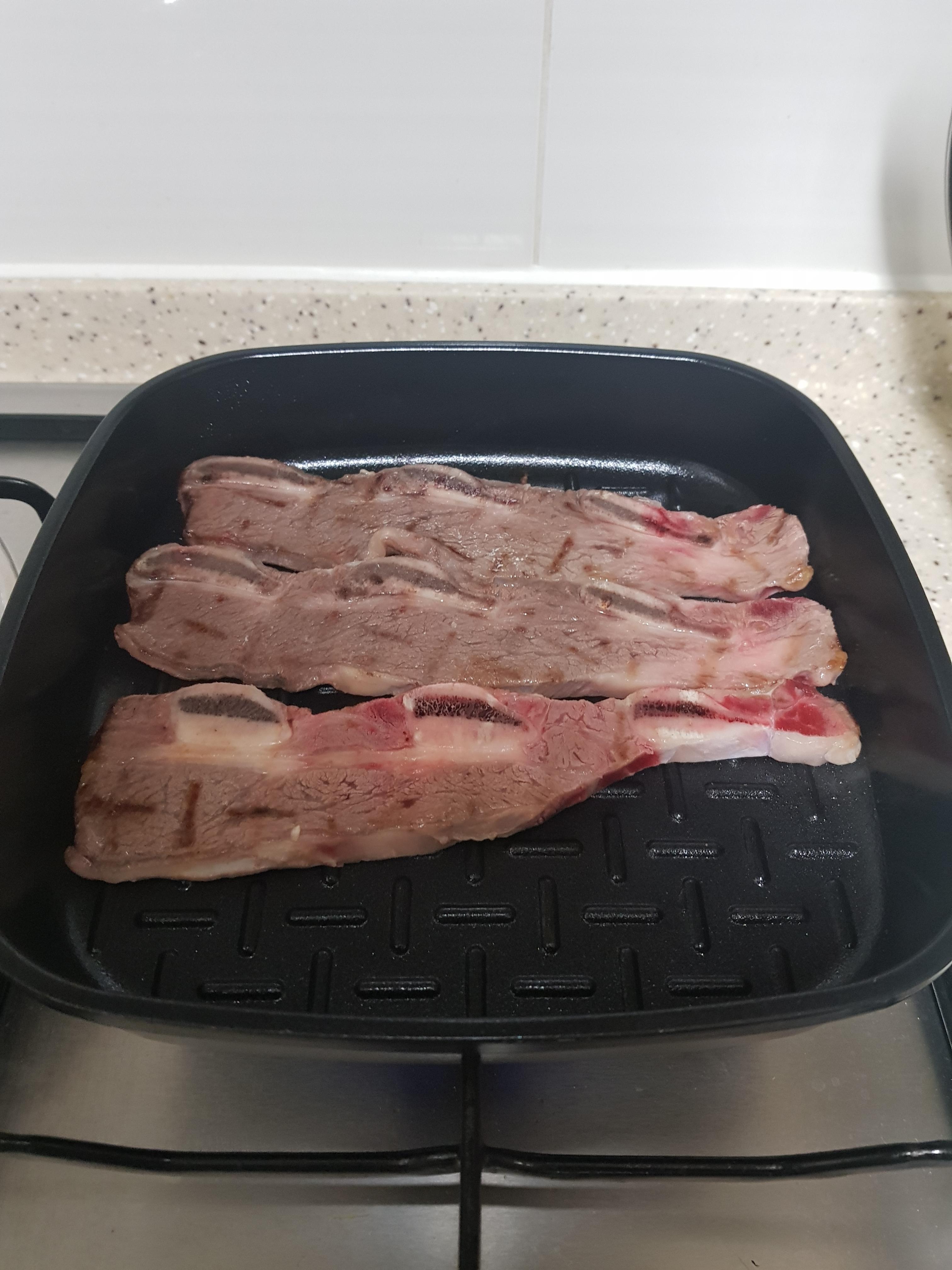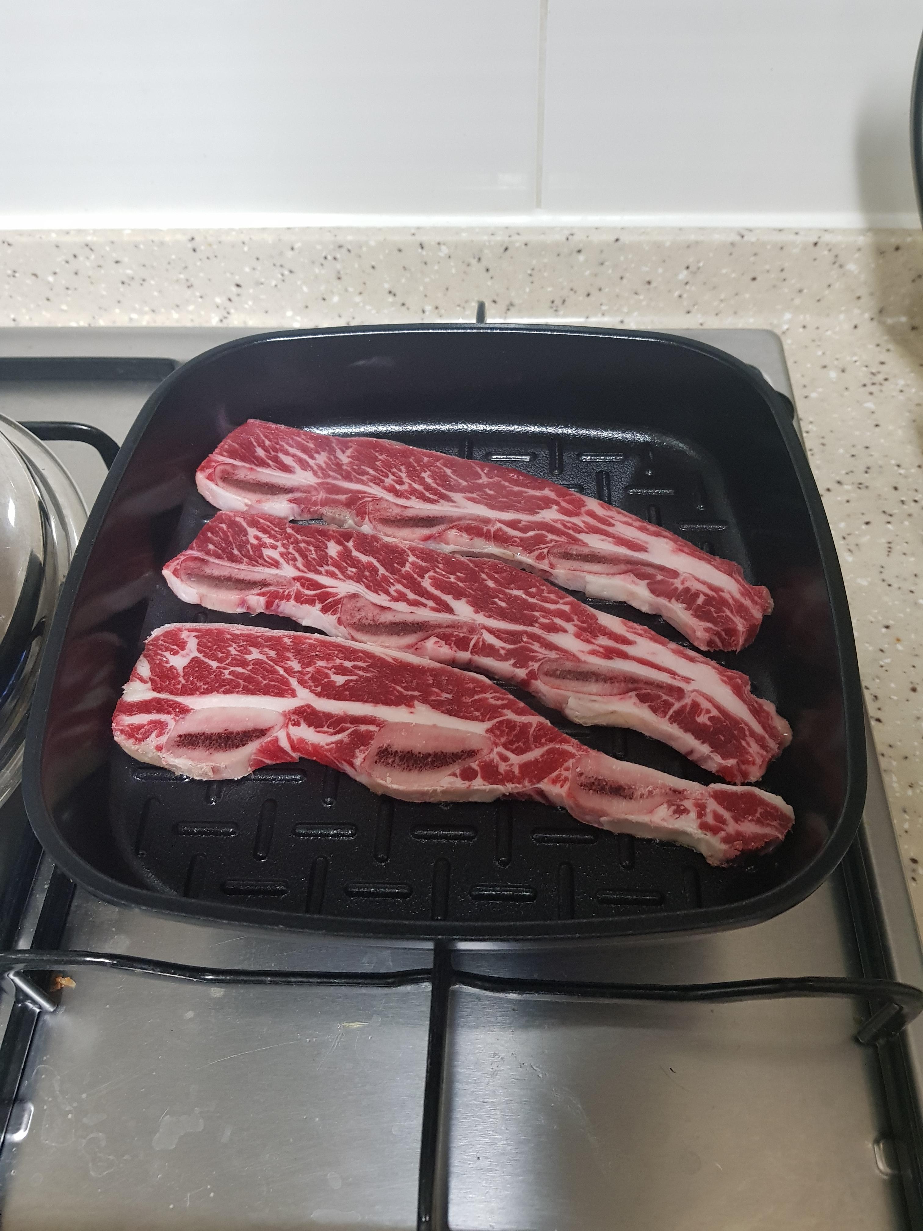 먼저 가열된 보오글 그릴냄비에 고기 3쪽을 올려 봅니다.