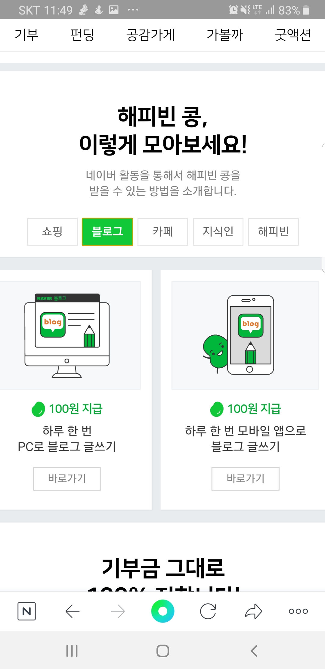 네이버 해피빈 콩기부를 하면 일정기간이 지나면 '꽝 없는 룰렛'이 메일로 옵니다.